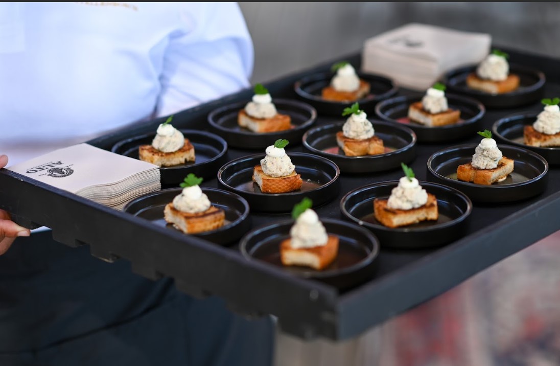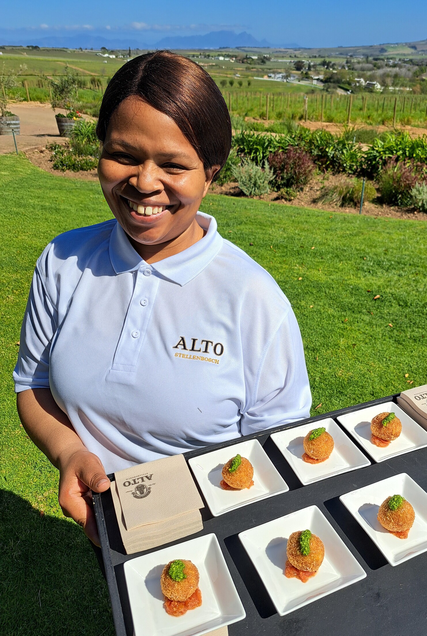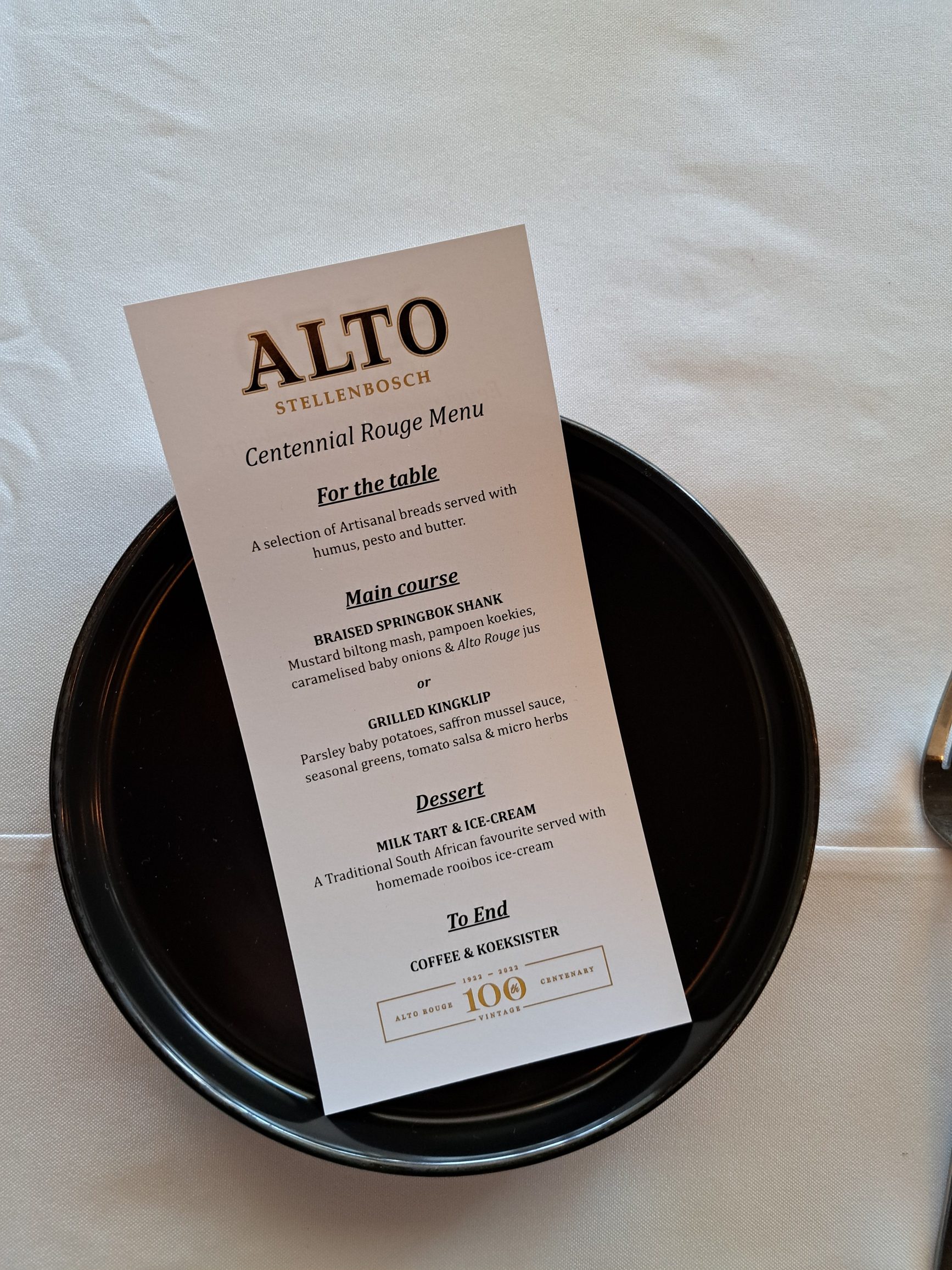 Ná die lekker wynproe, is daar na die restaurant en proelokaal beweeg vir die noenmaal. Gaste het begin met ‘n verskeidenheid kreatiewe broodgebak met hoemoes, pesto en botter. Hoofgereg was ‘n keuse tussen gesmoorde springbokskenkel met mosterd biltong kapokaartappels, pampoenkoekies, gekarameliseerde baba uitjies en Alto Rouge jus of geroosterde vis met pietersielie baba-aartappels, safraan mosselsous, seisonale groen groente, tamatie-salsa en mikro-kruie. En mens kan mos nie erfenis vier sonder melktert nie! Nagereg was inderdaad dié gebakte lekkerte met rooibosroomys.