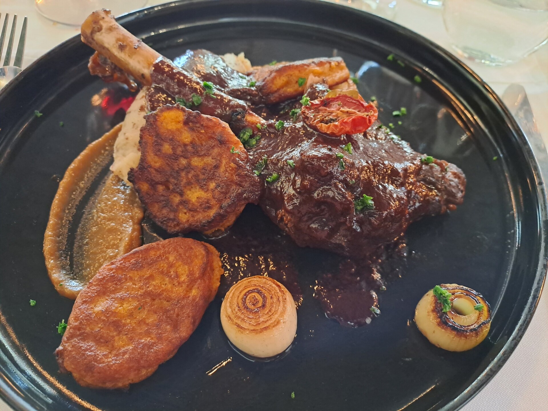 - My hoofgereg-keuse was gesmoorde springbokskenkel met mosterd biltong kapokaartappels, pampoenkoekies, gekarameliseerde baba uitjies en Alto Rouge jus.