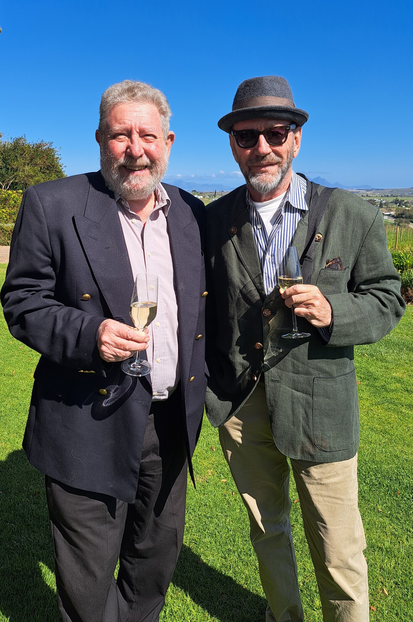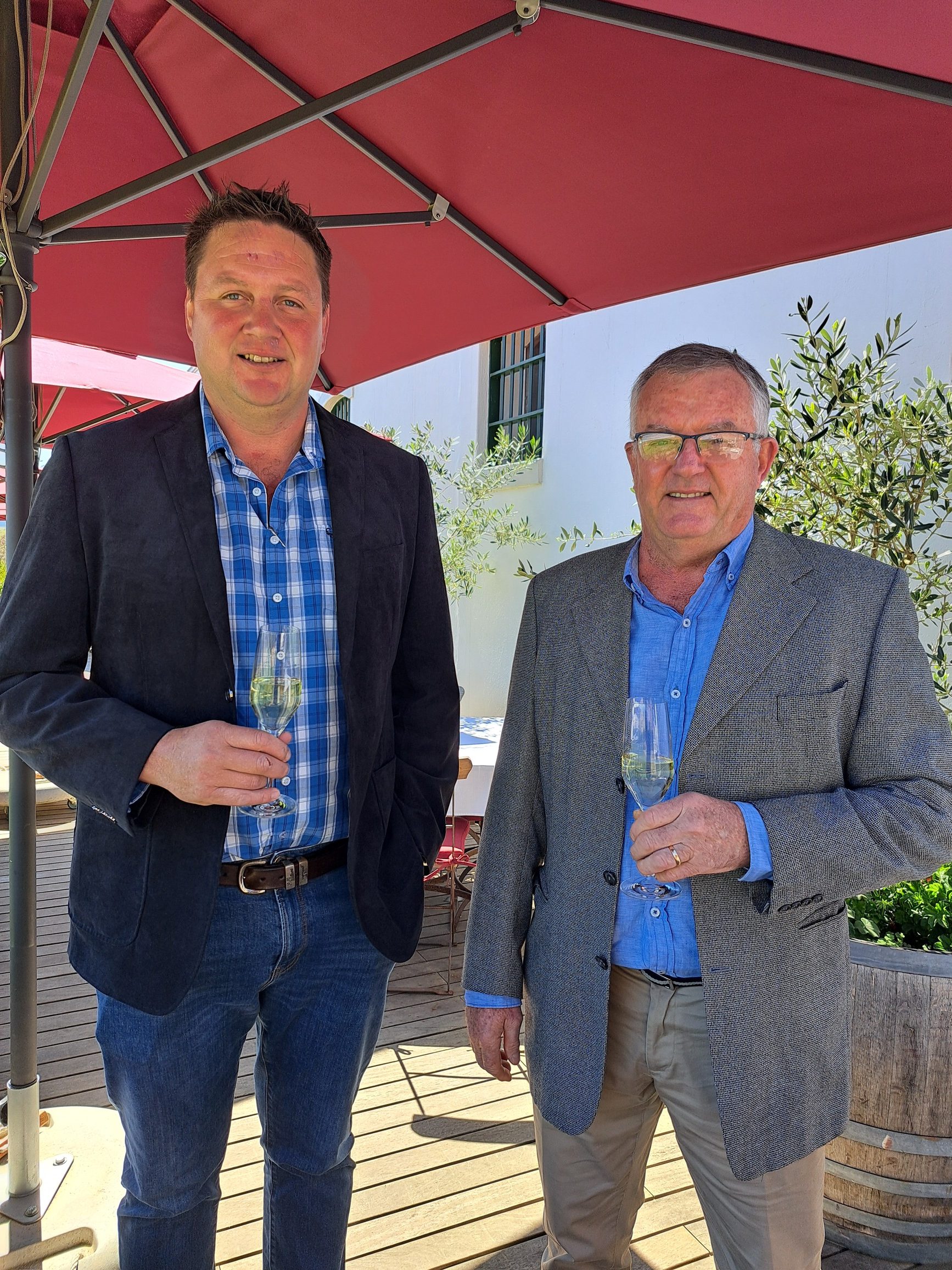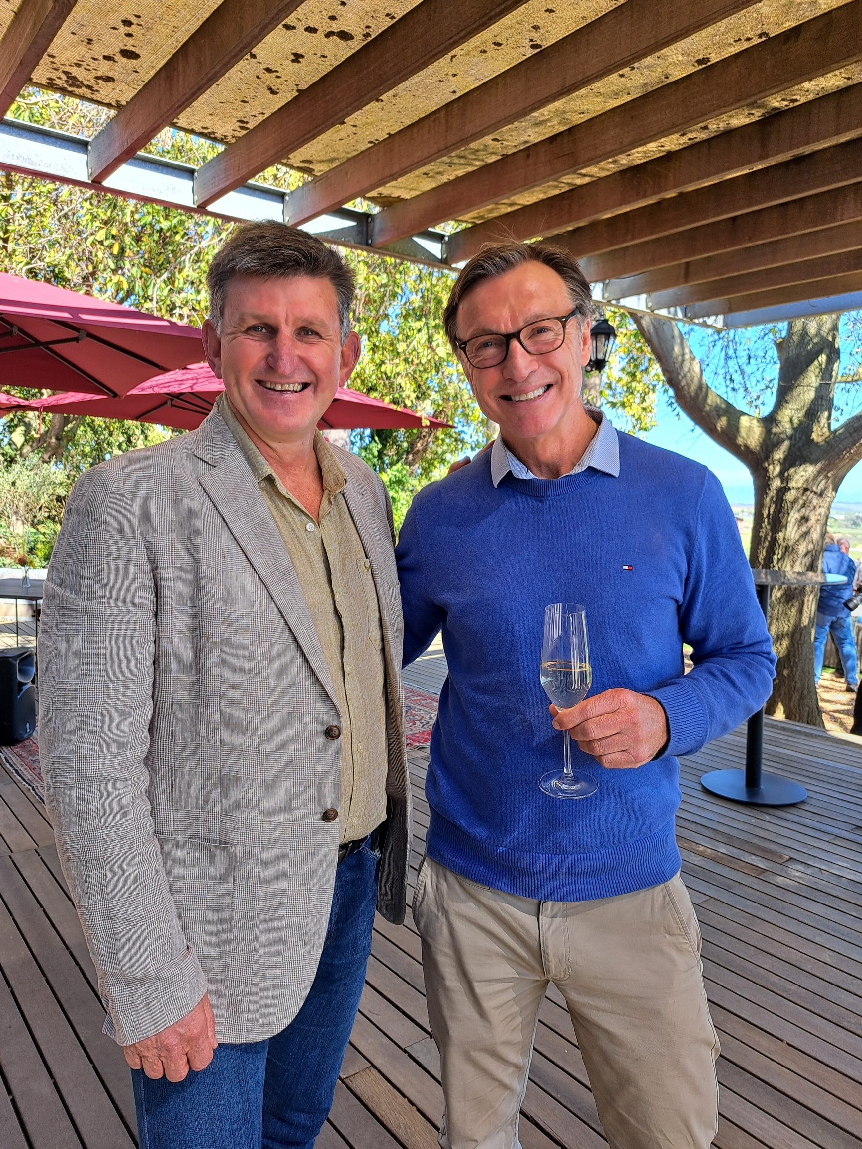 - Legendariese wynmakers, Neil Ellis en Jean Engelbrecht, kuier gesellig.