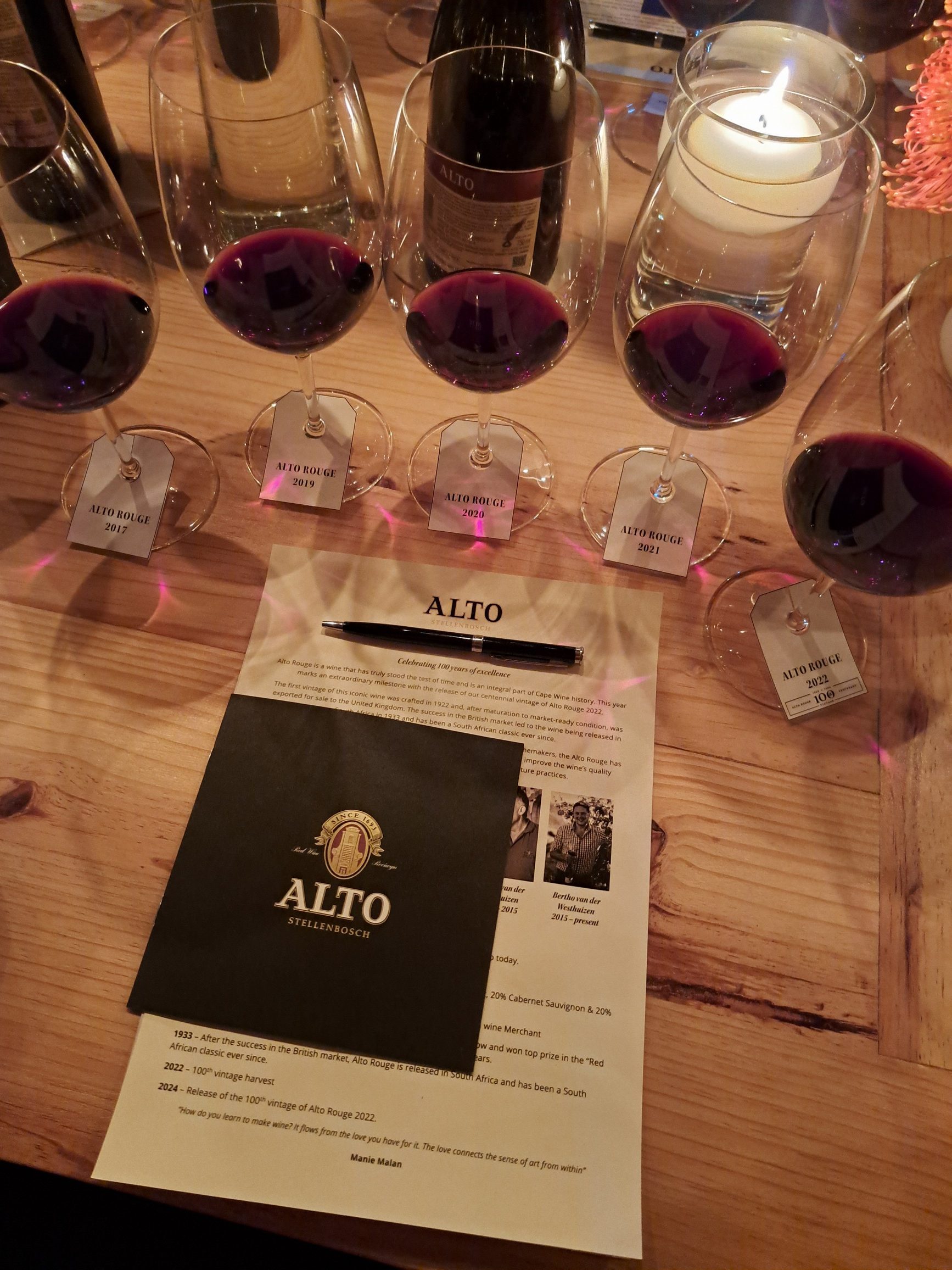 Daar het gaste vyf oesjare – 2017, 2019, 2020, 2021 en 2022 – geproe, terwyl verskeie sprekers hoogtepunte uit die kelder se geskiedenis gedeel het. Die versnitte verskil elke jaar omdat net die beste druiwe uitgesoek word, maar vir die historiese 2022-oesjaar is die samestelling 44% Cabernet Sauvignon, 42% Shiraz, 12% Cabernet Franc en 2% Petit Verdot. Van die ander oesjare wat geproe is, het onder meer Merlot en Shiraz-komponente gehad.