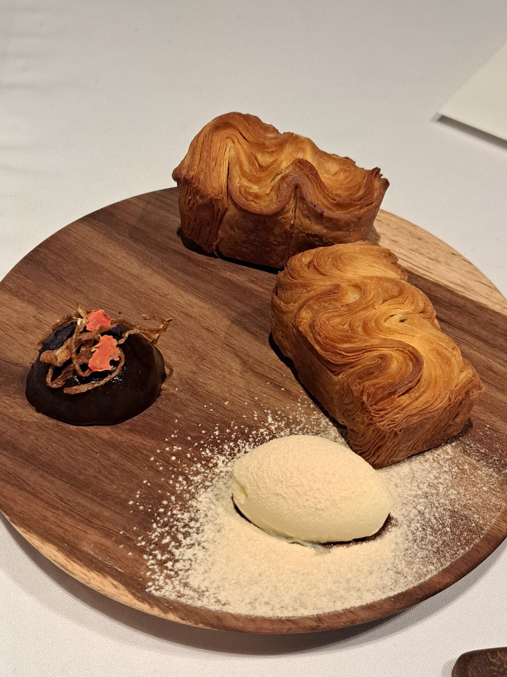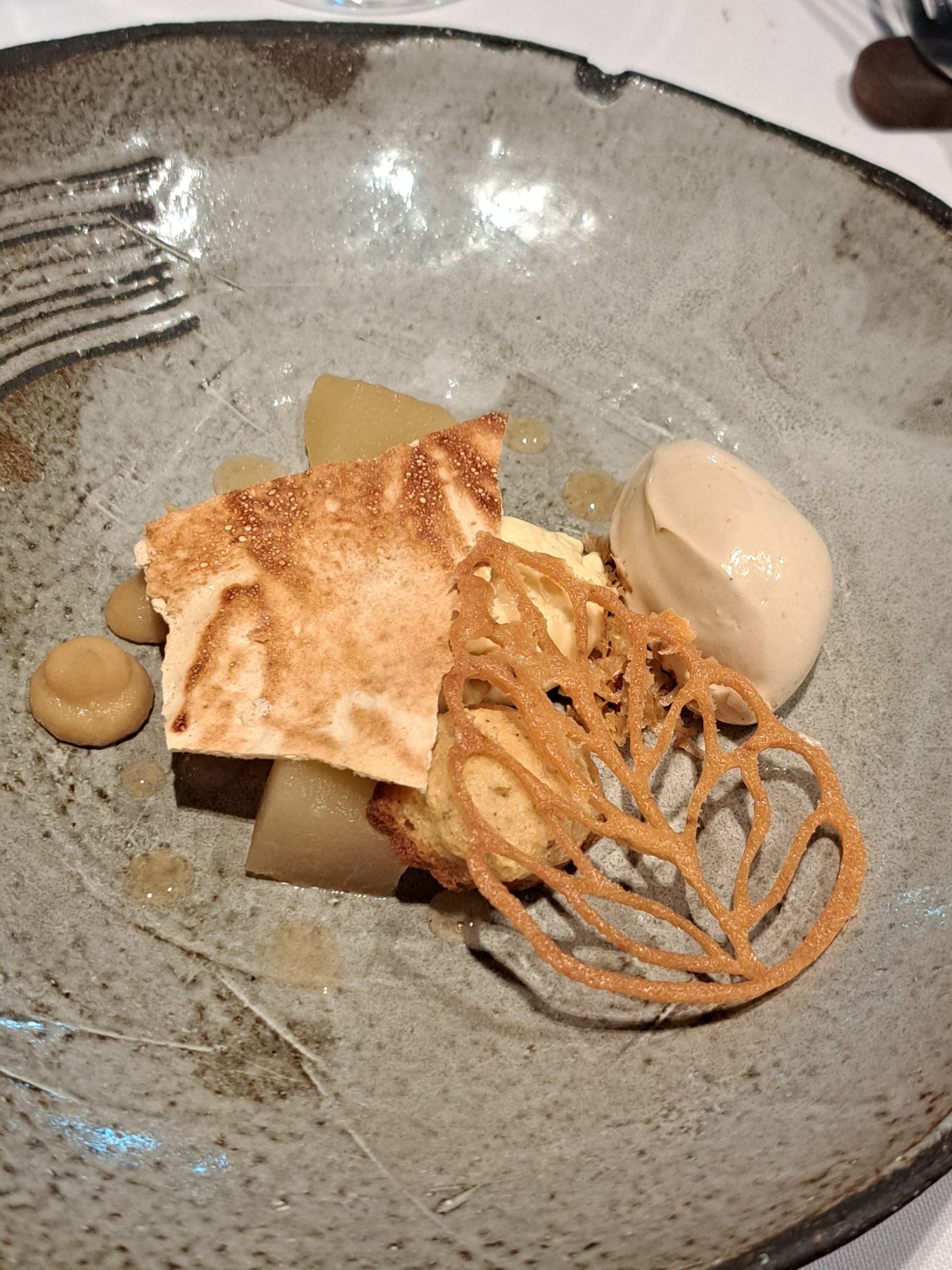 - Nagereg so reg uit Frankryk, Madeleine, met kastaiingroomys, geposjeerde peer en koffie meringue.