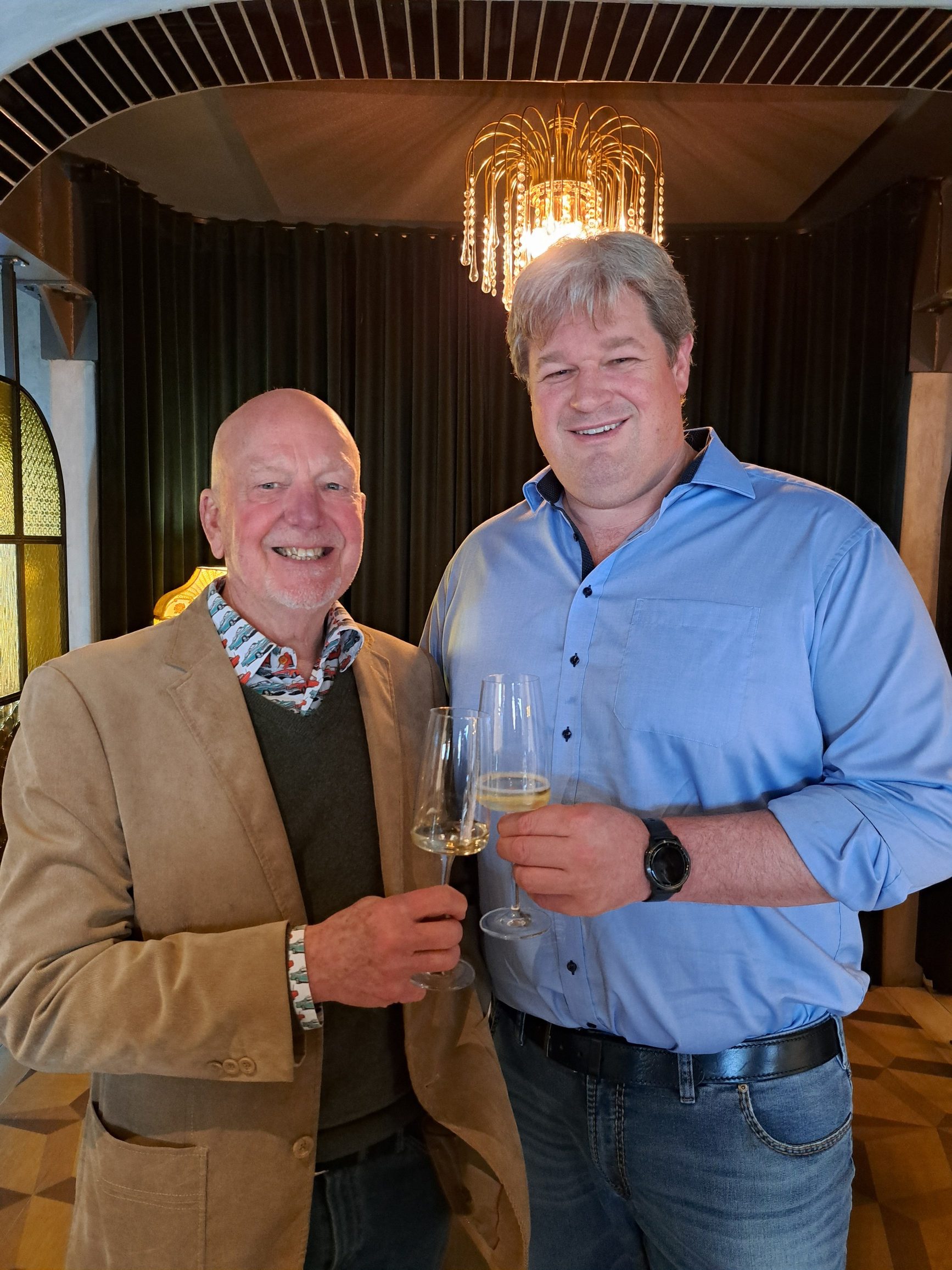 - Peter en Melvyn Minnaar, wynskrywer en Peter de Wet klink ‘n glasie op Peter se lekker vonkelwyn.