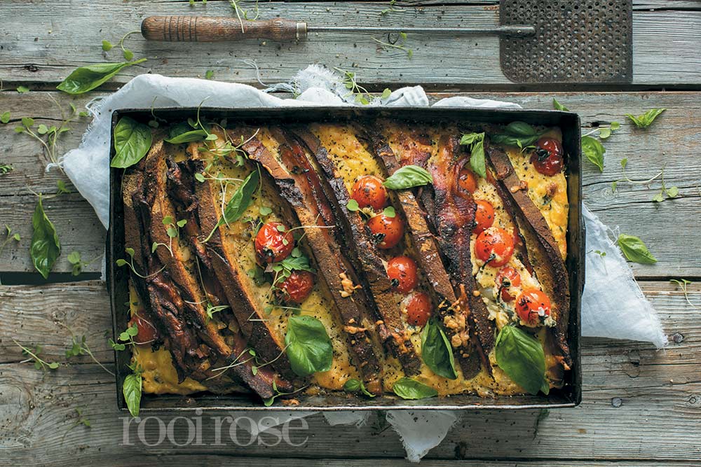 - Smeer ’n 22 cm x 34 cm-bak met 2 e (30 ml) botter en pak die roosterbrood daarin. Pak die spekrepies tussen die snye en skep die gebraaide uiemengsel en tamaties eweredig oor die brood. Strooi die kaas oor.