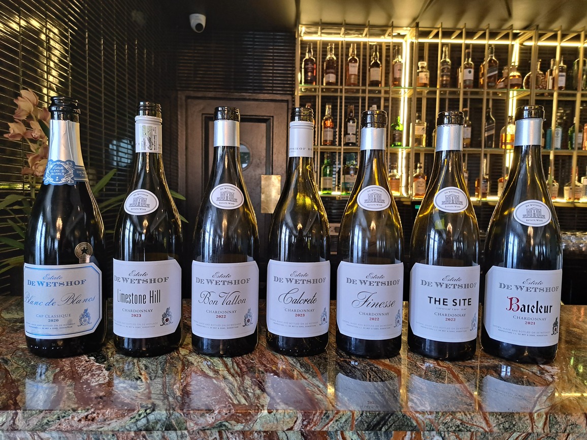 Gaste het sewe Chardonnays geproe: die Blanc de Blancs Cap Classique, Limestone Hill 2023, Bon Vallon 2022, Finesse 2022, The Site 2022 en Bateleur 2021.