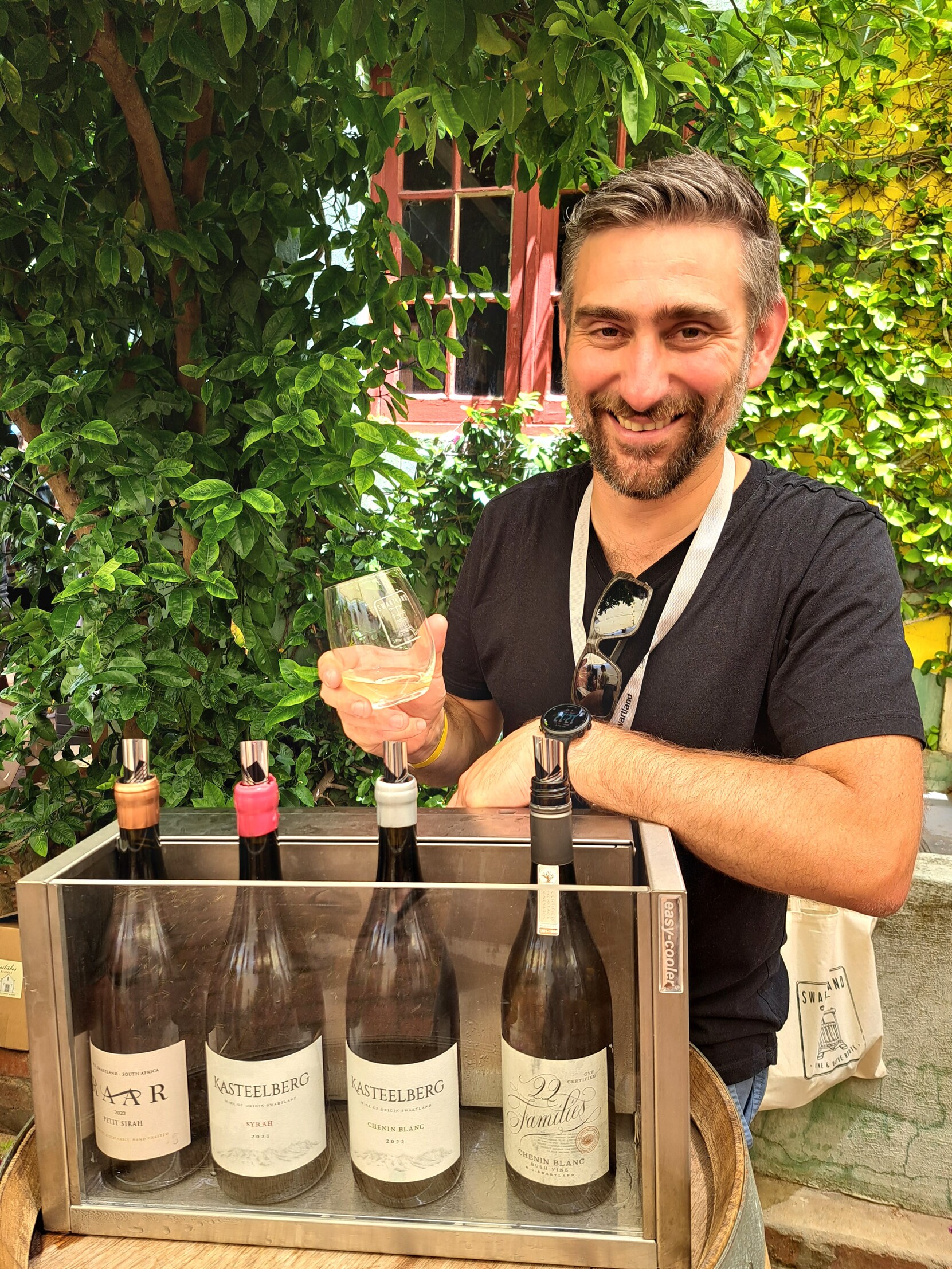 Testalonga met die etos: “Made from grapes” het verskeie wyne te proe aangebied, onder die El Bandito-etiket en ook twee onder die Baby Bandito-etiket. Hier staan Craig Hawkins met die El Bandito Skin 2022, ’n dopkontak Chenin blanc.
