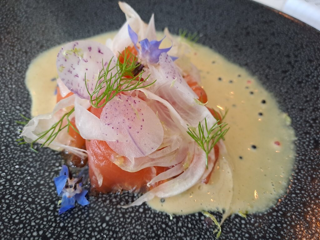 - Onder die disse wat aangebied is, was ’n voorgereg van salm in ’n botter-sous, sitrus en viskuit.