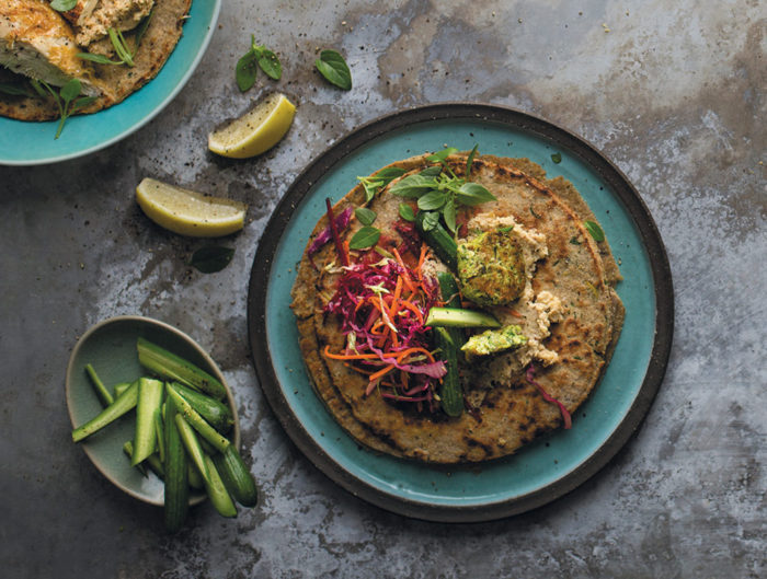 en smeer die res van die bottermengsel oor. Bak vir 30-40 min. of tot gaar na smaak. Draai die rol een keer gedurende die bak-tyd om. - Hoemoessous: Verwerk die kekerertjies, Bulgaarse jogurt, suurlemoenskil en -sap, knoffel, 8 ml komynsaad, olyf- of avokado-olie en koljanderblare tot glad in ’n voedselverwerker. Geur na smaak.