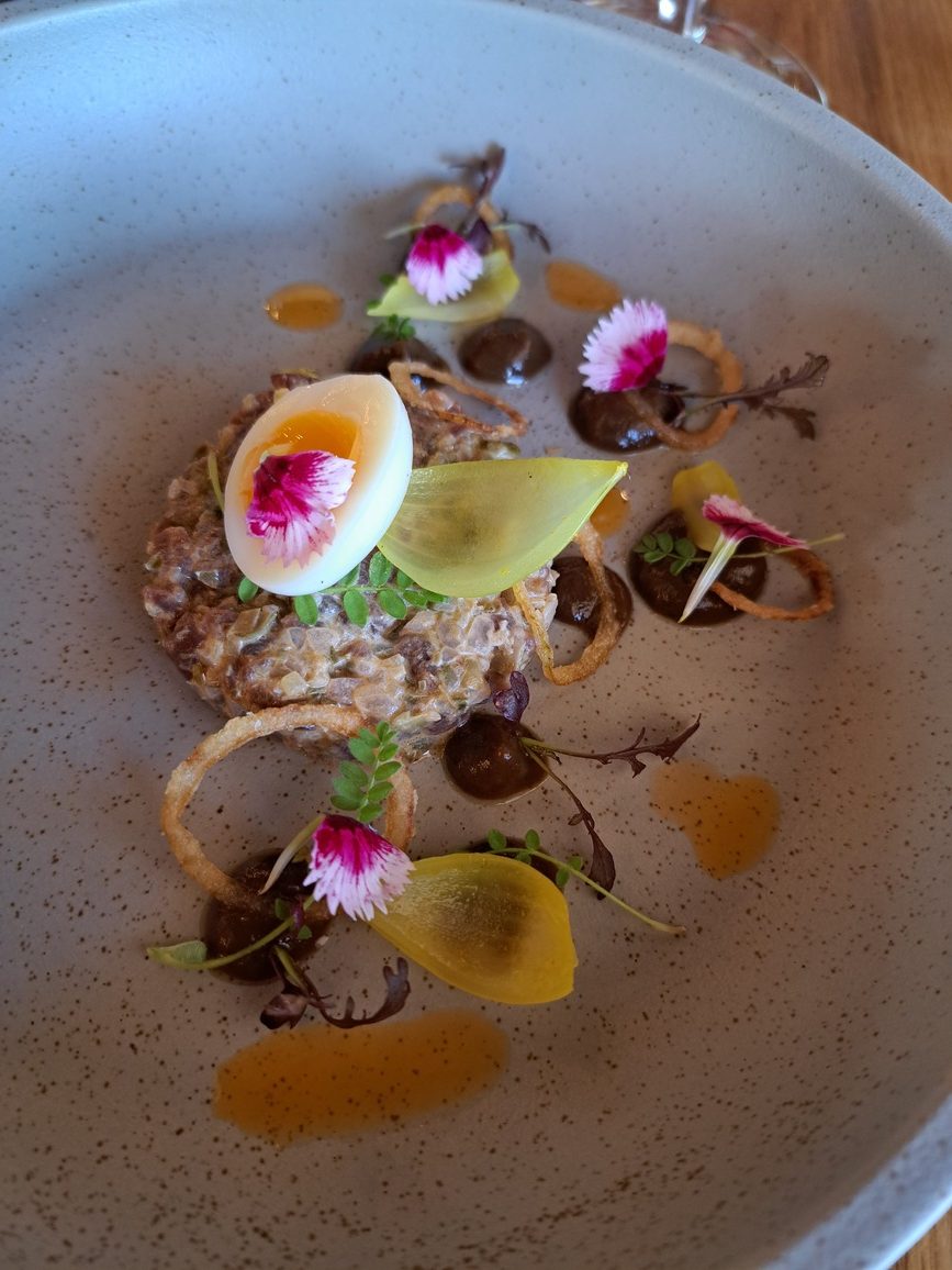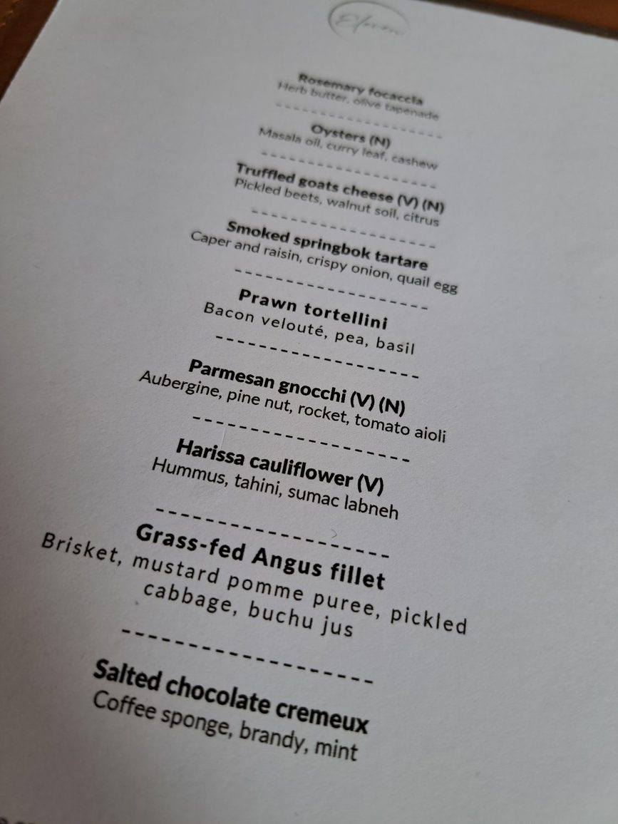 Die spyskaart bied die beste seisoenale opsies en daar is heerlikhede soos truffel-bokmelkkaas met gepekelde beet, sitrusjel en okkerneut stof; gerookte springbok tartare met eiergeel, rosyntjie en kappertjiepuree om maar net enkeles te noem.