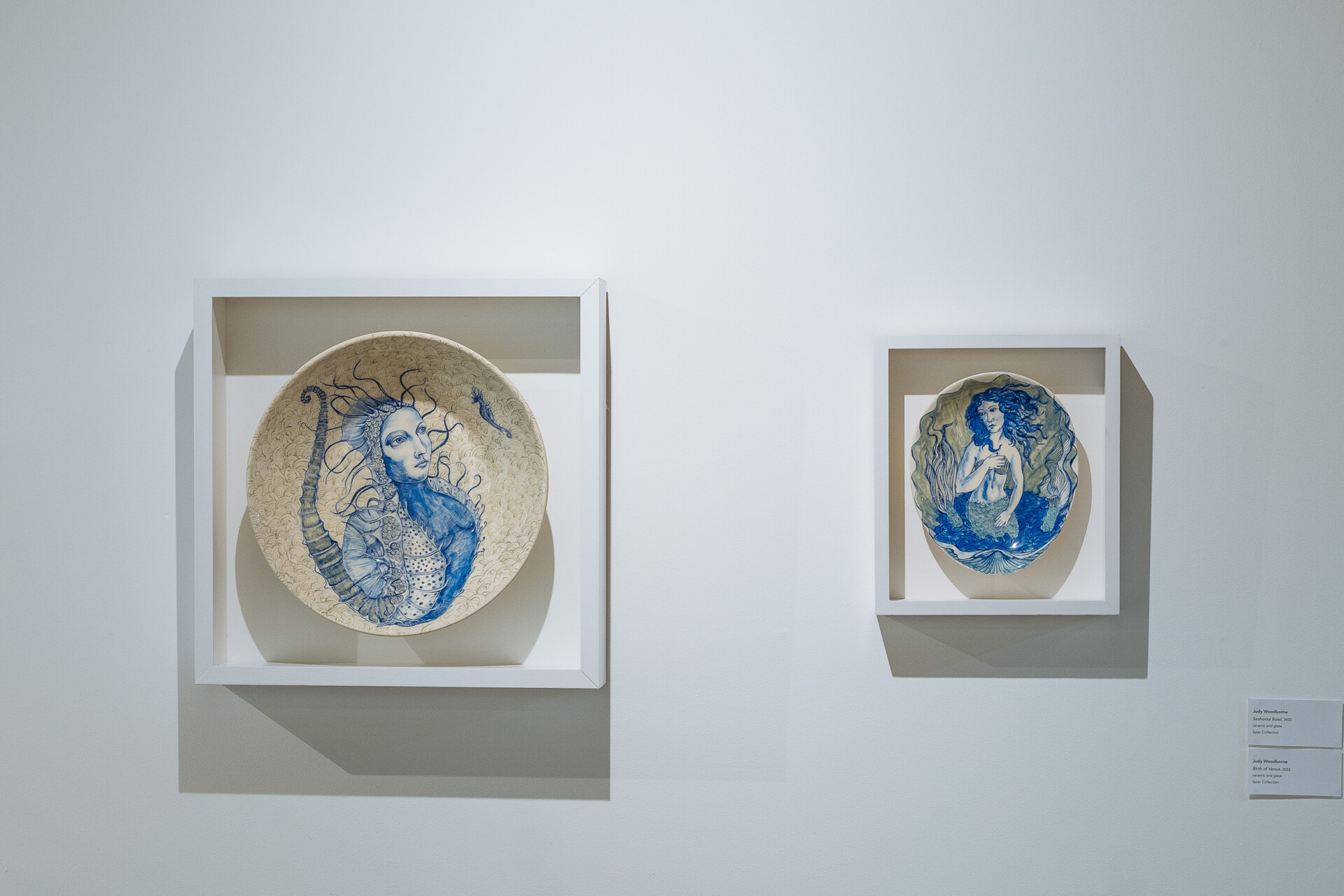 - Twee kleiborde van Judy Woodborne, “Seahorse Bowl” en “Birth of Venus”, is deel van die uitstalling. Dis albei geglasuurde keramiek.