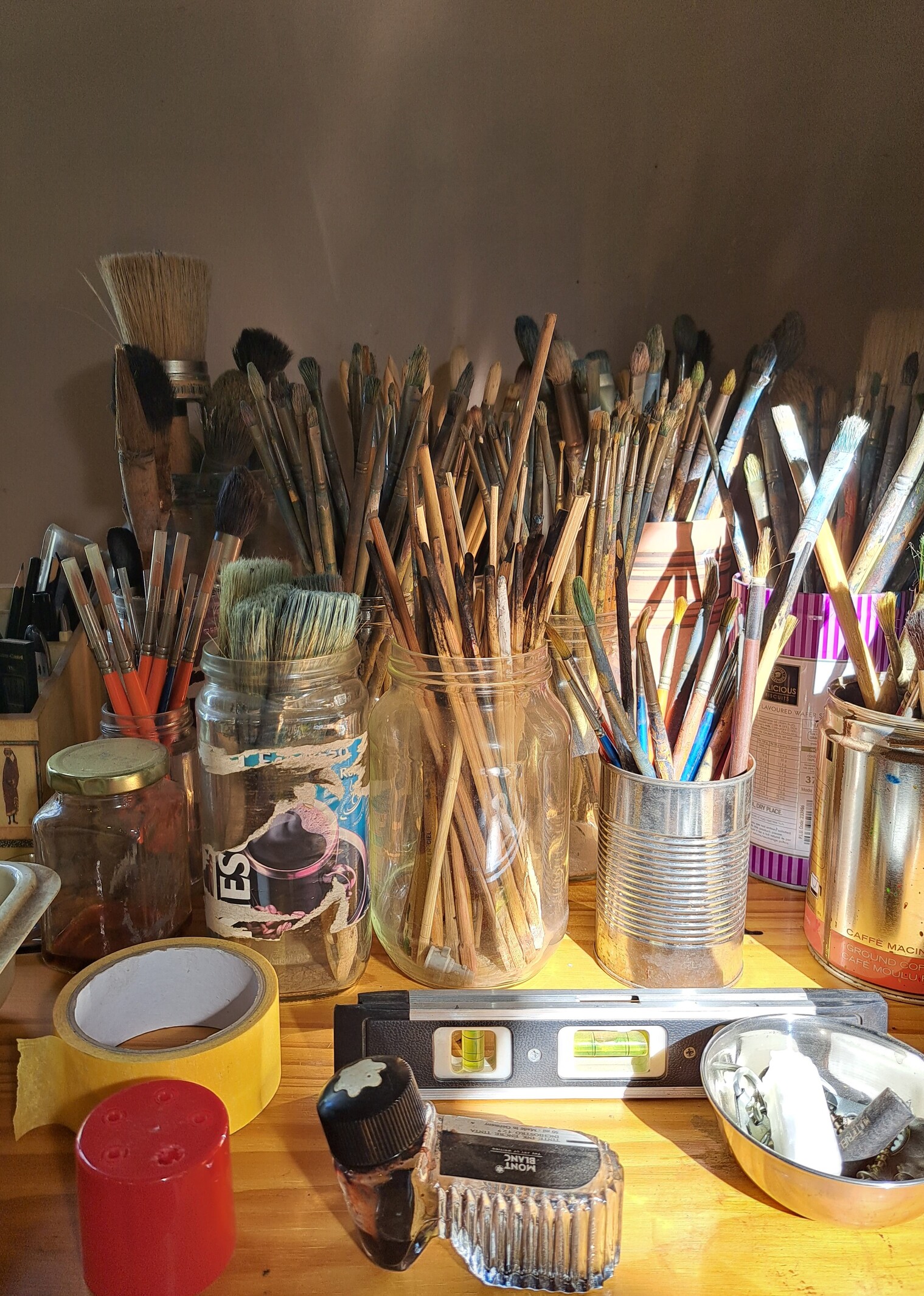 - Met die namiddagson wat ’n klein hoekie in die atleljee van Andre Francois van Vuuren verlig, is selfs verfkwasse en maskeerband ’n kunswerk.
