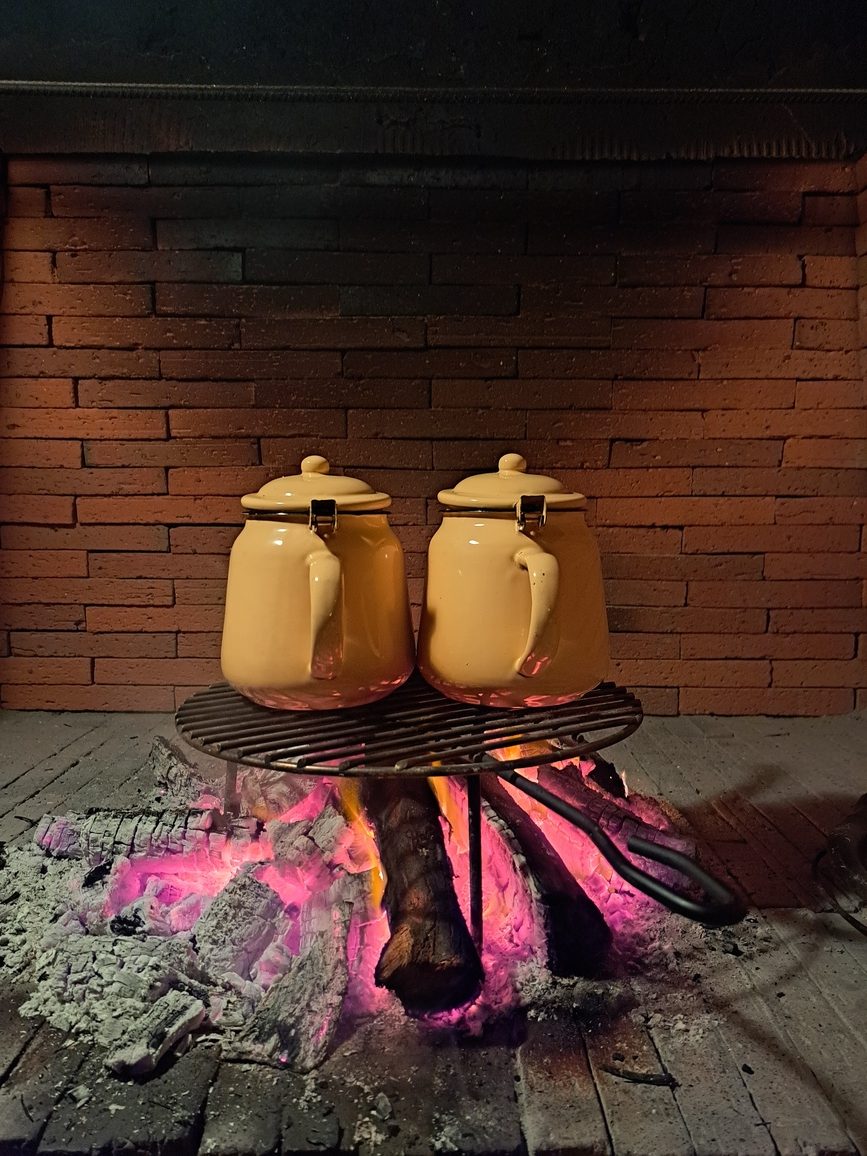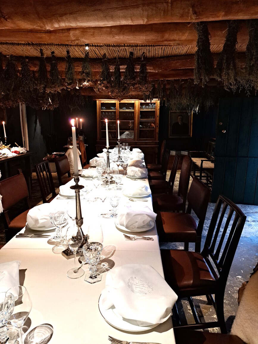 Daar word hande in ’n waskom en beker gewas, voor die spys en drank bedien word. Daar is net een langtafel wat 16 gaste kan huisves en almal kuier oor en weer, soos in die ou dae, vertel Jan Hendrik.