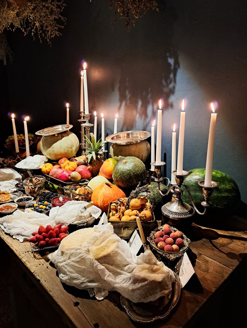- ’n Kaas-, neute- en vrugtetafel wat aan ’n antieke skildery herinner. Met ons aankoms was die helfte van die heerlikhede nog in voorbereiding en sou dié tafel uit sy nate bars teen die tyd wat ons by dié gang kom.