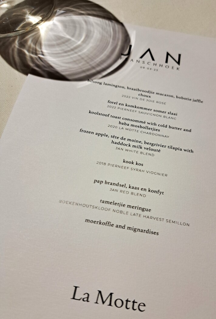 Die maaltyd wat ten tyde van ons besoek bedien is, het onder meer biltong Lamingtons, ’n braaibroodjie makrolletjie en bobotie jaffel choux as verwelkomingshappie met ’n glas Vin de Joie Rosé 2018; daarna forel-en-komkommer somerslaai met Pierneef Sauvignon blanc 2022; koolstoof roosterbrood consommé met koue botter en baba mosbolletjies met La Motte Chardonnay 2020; gevriesde appel, tête de moine, Bergrivier tilapia met skelvis-melk velouté met die JAN White Blend; kookkos met die Pierneef Syrah Viognier 2019; en pap brandsel, kaas en konfyt met die JAN Red Blend ingesluit.