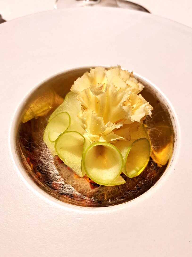 - Kos te mooi om te eet. Die gevriesde appel, tête de moine en Bergrivier tilapia met skelvis-melk velouté, is met die JAN White Blend voorgesit.