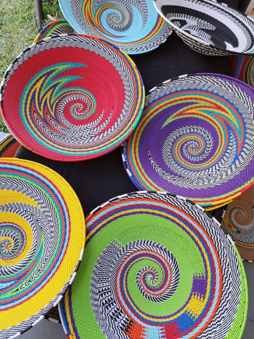 - Veelkleurige vrugtebakke of muurbehangsels gevleg uit telefoondraad, kikker sommer enige vaal hoekie op.