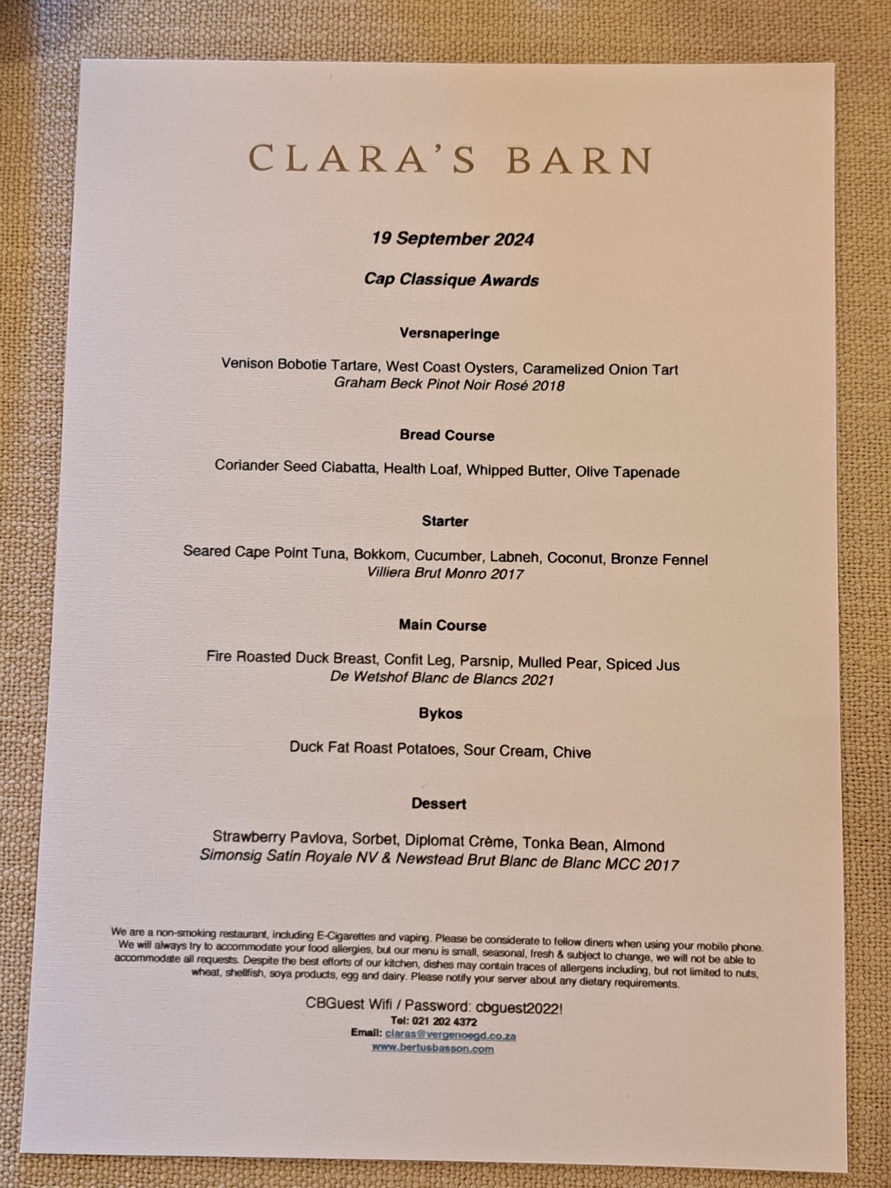 - Die spyskaart vir die geleentheid waar elke gereg met ‘n ander wen-vonkelwyn gepasmaat is.