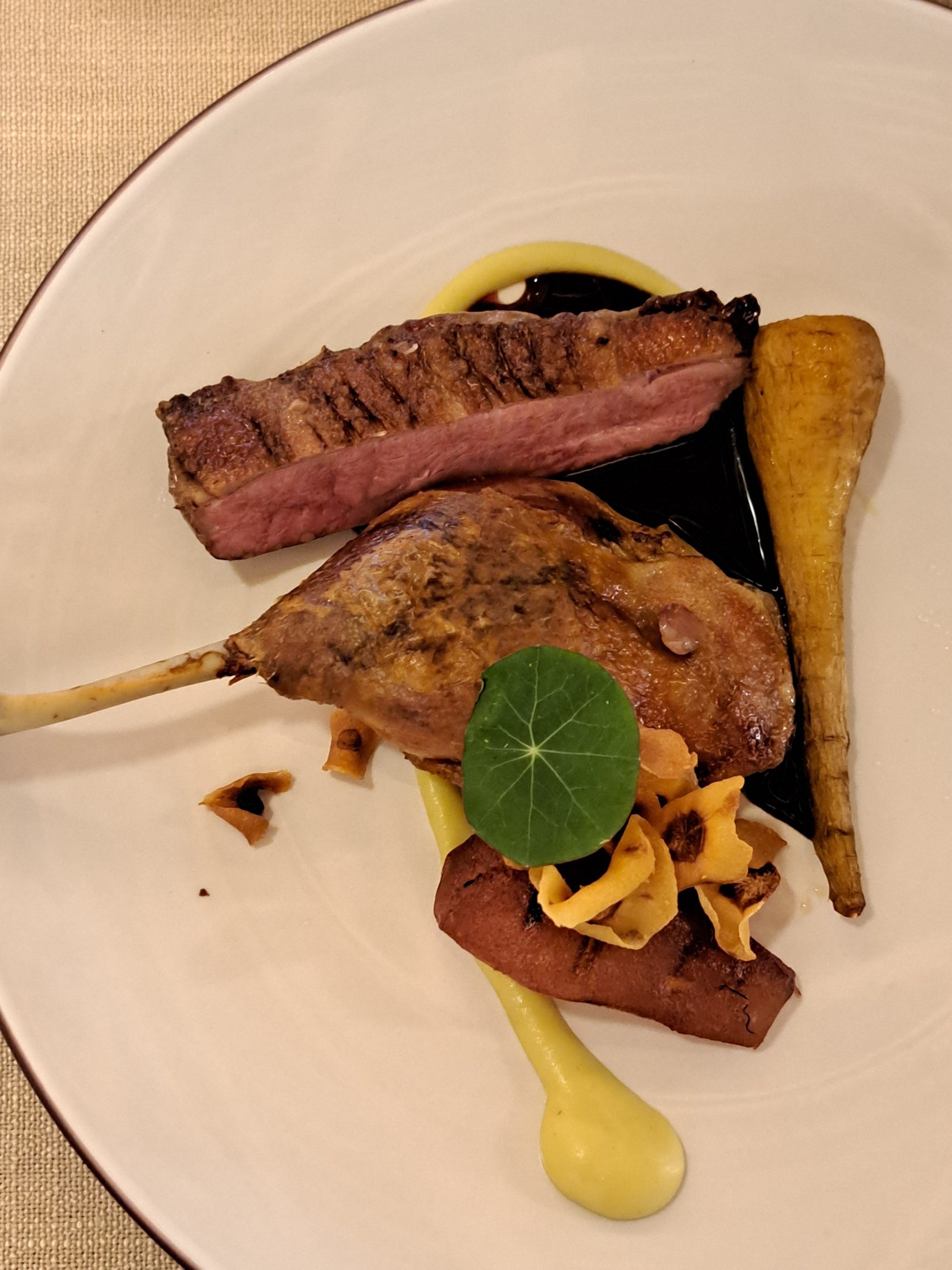 - Hoofgereg van geroosterde eend met peer, spesery en witwortel, is met die De Wetshof Blanc de Blancs 2021 – trofeewenner vir Beste Blanc de Blancs – geniet.