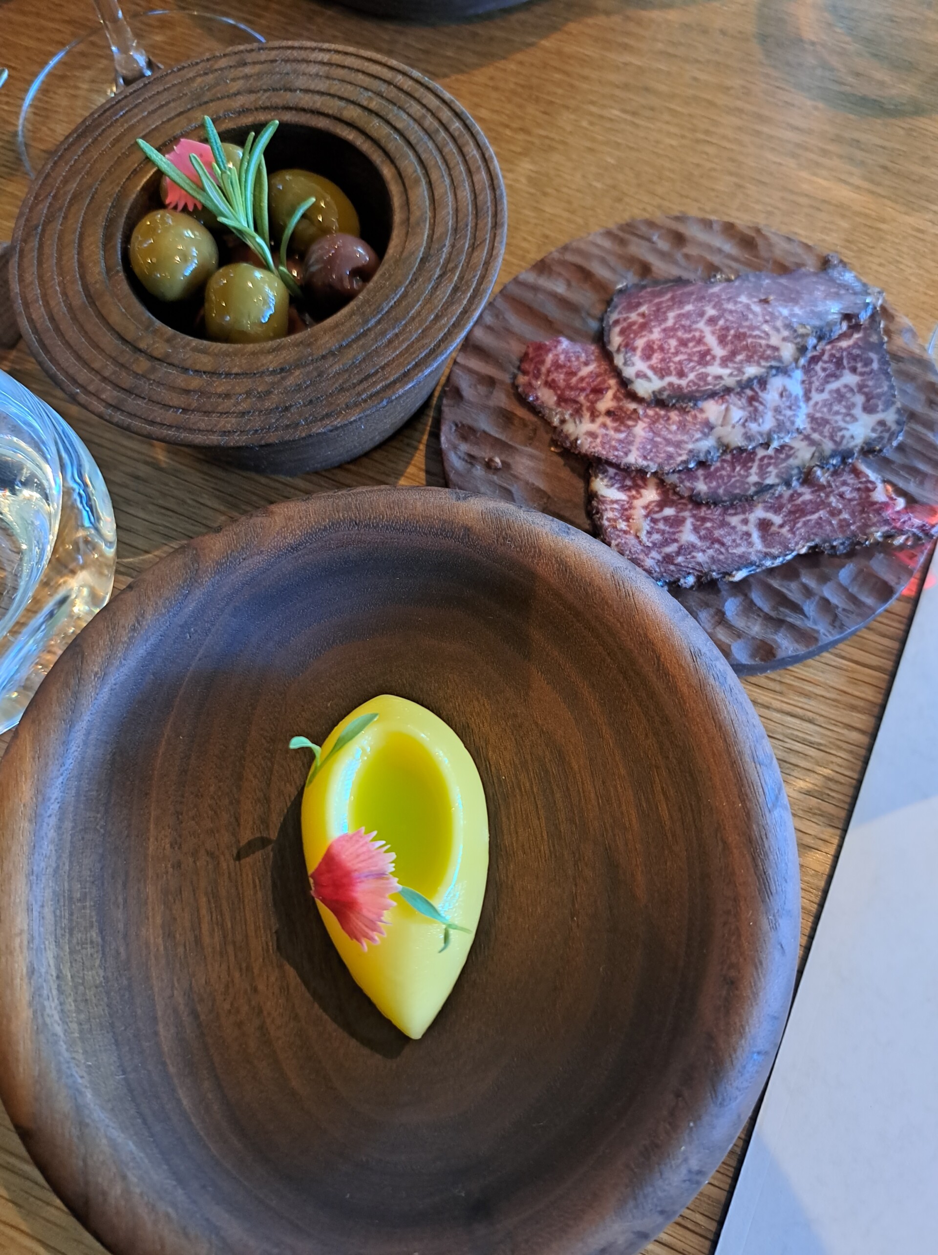 Die Leeu Passant Wellington Cinsault 2023 is met geroosterde suurdeegbrood, olywe, botter, biltong en ‘n rooiui en bees-tertjie bedien.