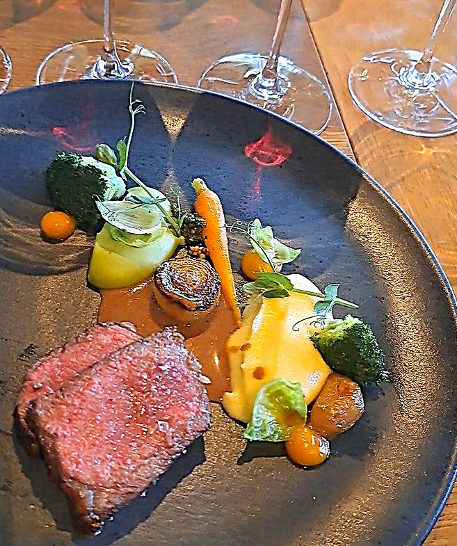 - Die hoofgereg van Karoo Wagyu, gebotterde aartappelpuree en Porcini is met die Leeu Passant The Leeu Passant 2022 voorgesit.