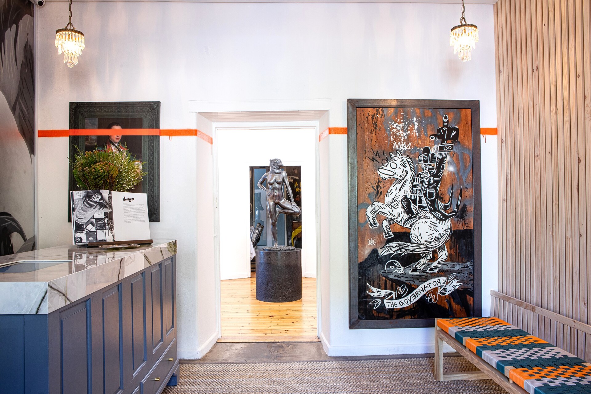 As jy by die ontvangs ingaan, word jy nou begroet deur “The Vandalized Vicount” wat oorkant Louis de Villiers se “The Governator”-stuk hang. Die kamer het natuurlike, onbehandelde dennelatte, elemente van groen marmeragtige porselein, ’n blomme-installasie deur Marissa Pretorius van Opus Studio en ’n veelkleurige bankie van Vogel wat ’n voorsmakie bied van wat kom.