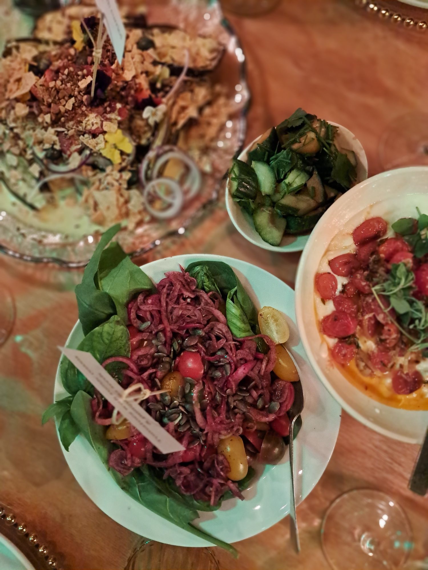 - Tapas van tamaties met sumac uie en pampoensaad; geroosterde eiervrug met kerrie-joghurt en gepekelde komkommer.