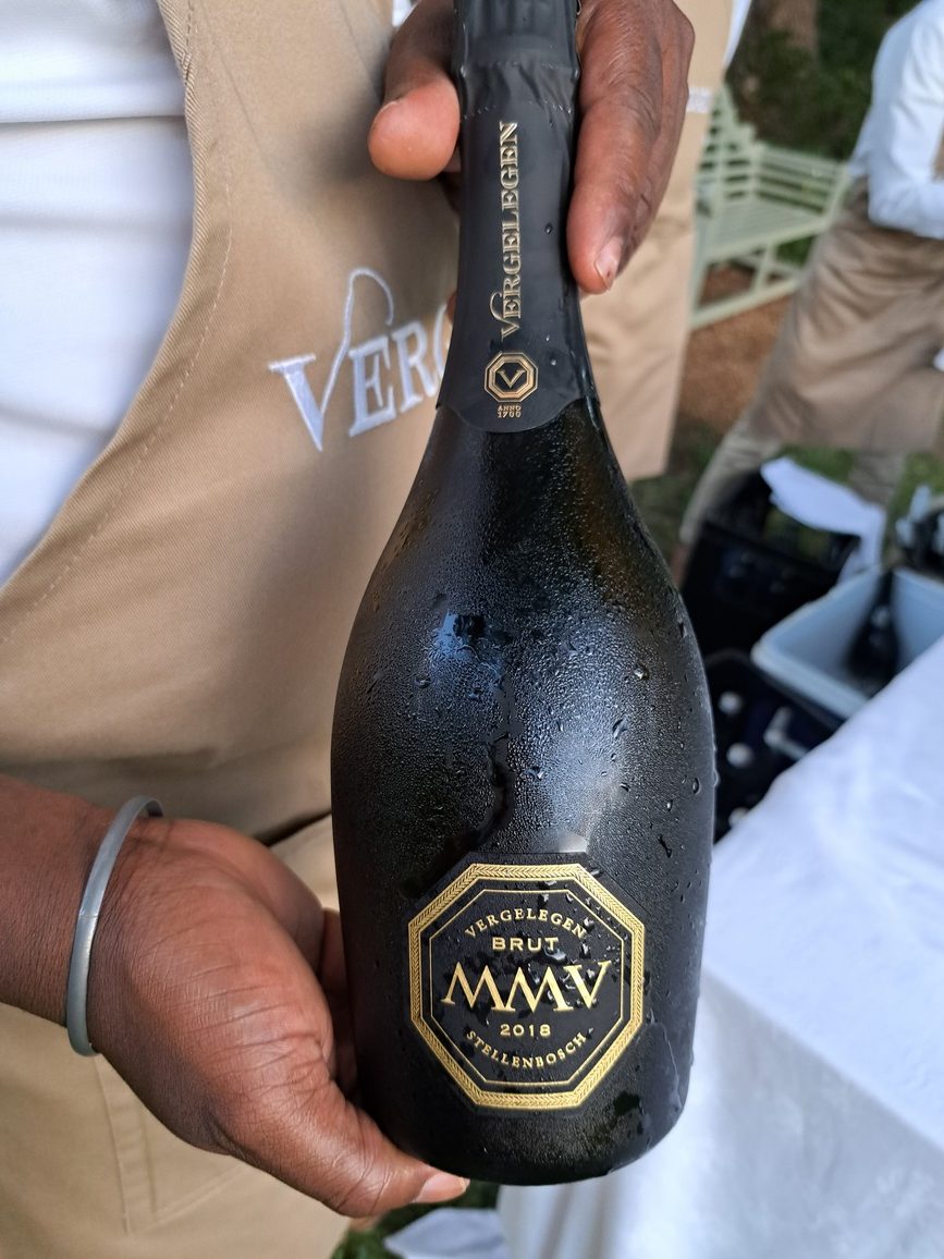 - Gaste kon die sonsondergang oor die historiese herehuis geniet met ’n glasie yskoue Vergelegen Brut MMV 2018.