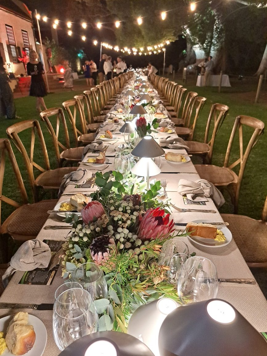 - Een langtafel waarby al die gaste gesit het, is voor die herehuis onder die ou kamferbome gedek.