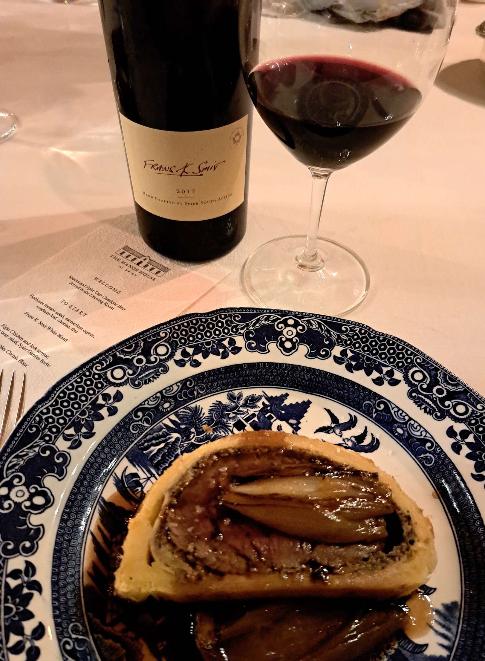 Die Farmer Angus Beef Wellington is met Creative Block 5 Bordelaise-sous en die Frans K. Smith Red Blend geniet. Daarby is gerookte beenmurg kapokaartappels met stadiggeroosterde beesstert en wortels uit die tuin, geniet.