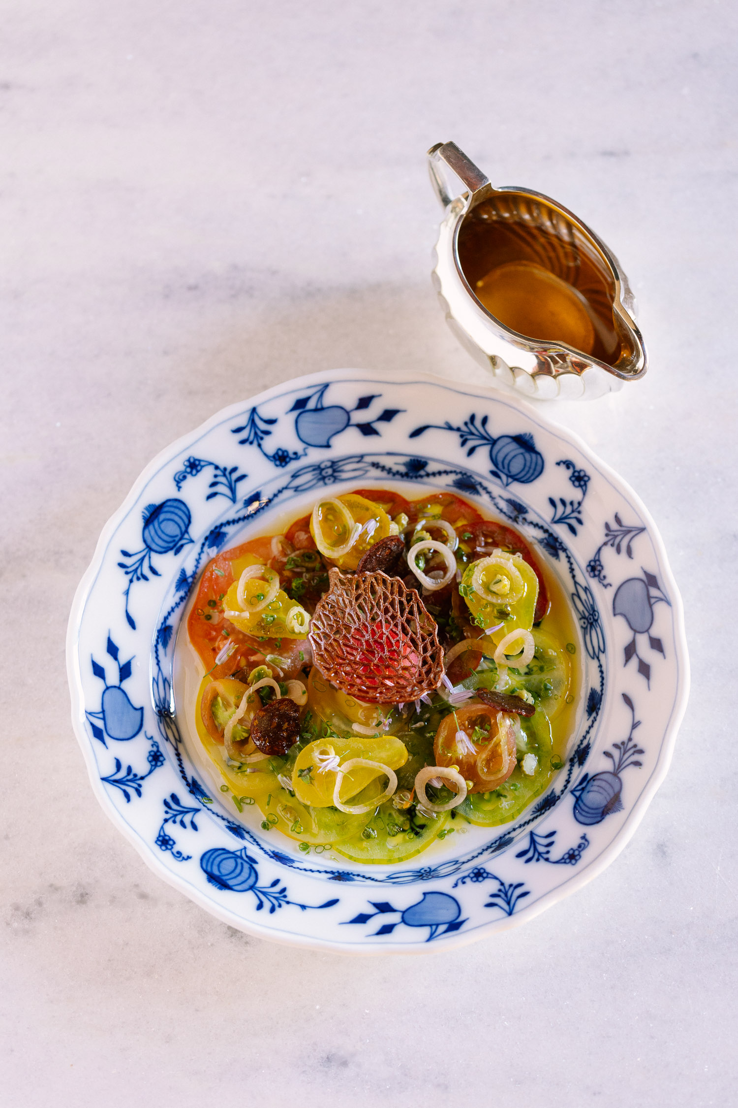 - Die voorgereg, Erfenistamatiesslaai met kappertjiesaad, sorghumblaar, chorizo en feta, met heerlike tamaties uit Megan McCarthy en haar span se tuin op die plaas.