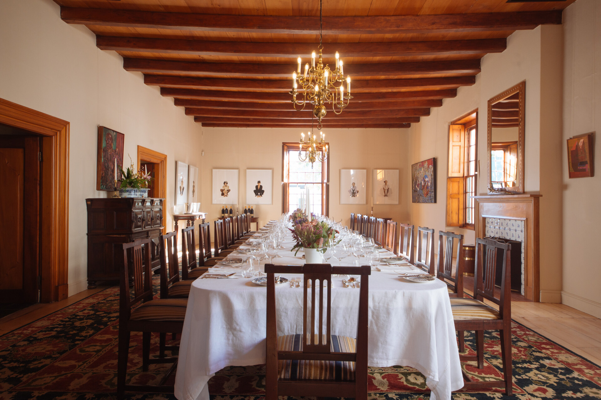 Ons sit by kerslig en ’n sweempie meubelpolitoer met wit linne soos 200 jaar gelede. Die blou en wit borde soos Simon van der Stel sou gebruik, ’n ode aan die herehuis se ouderdom en erfenis.