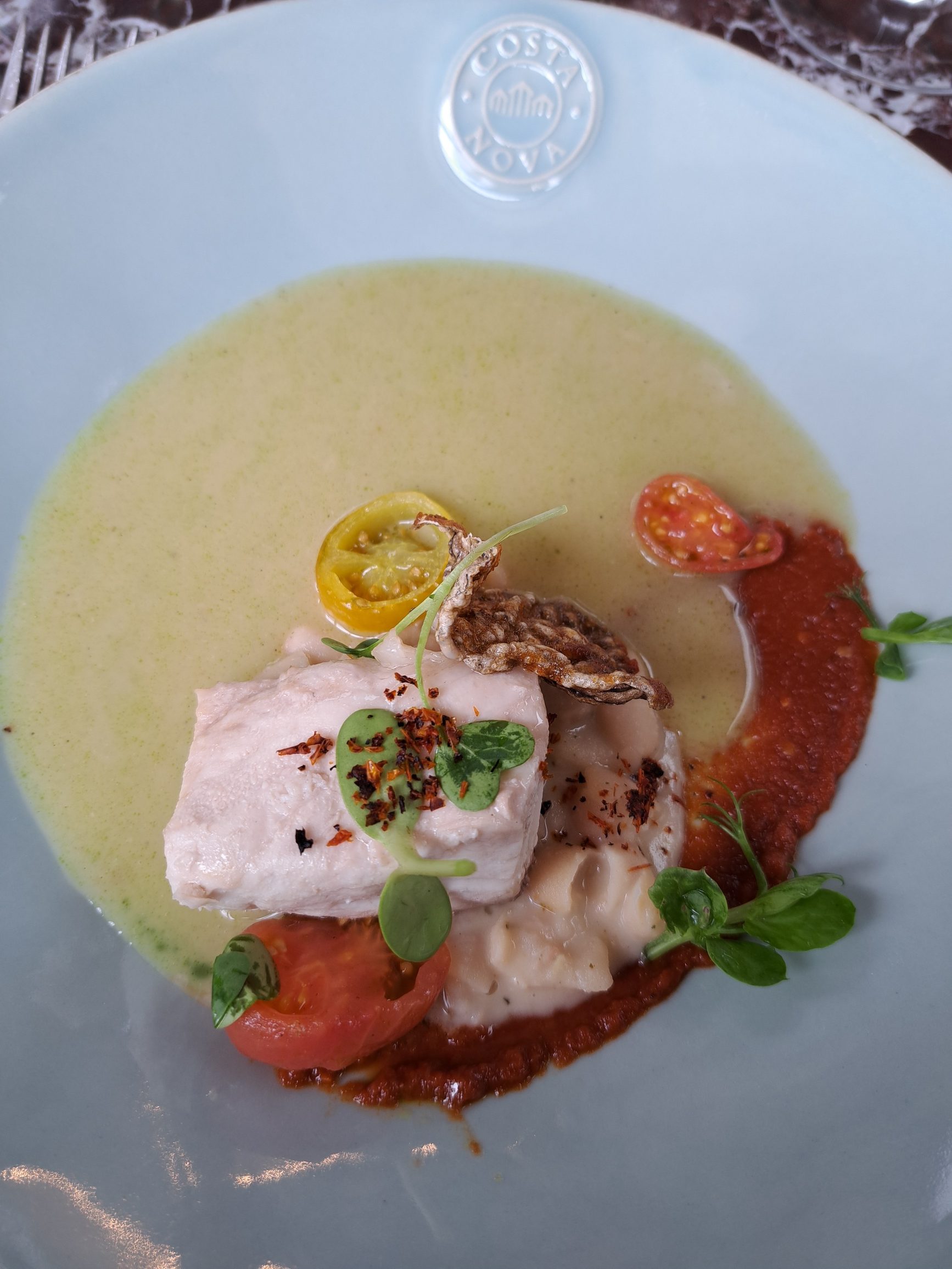 - Die dag se voorgereg was geposjeerde seebass met tamatie, witboon ragout en ‘n roomsop.