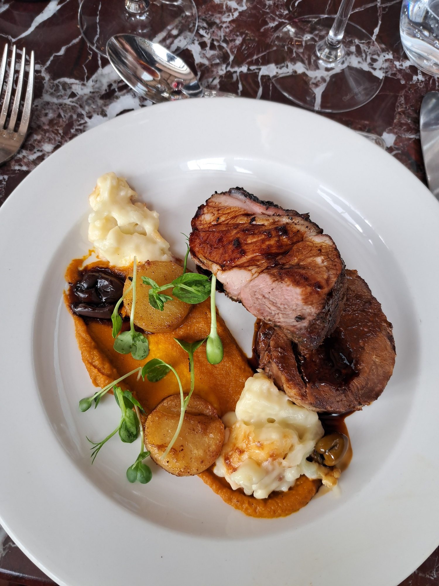 - Hoofgereg was lamsvleis met geroosterde wortelpuree, aartappel fondant en blomkool met kaas.