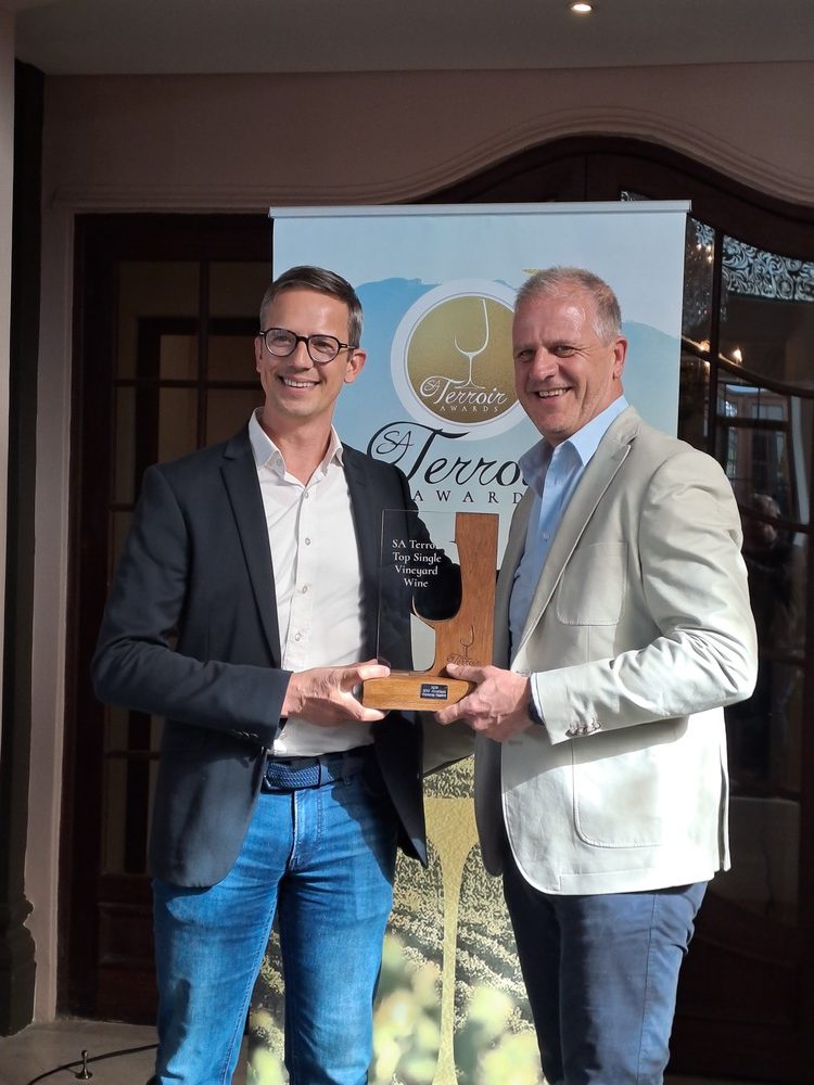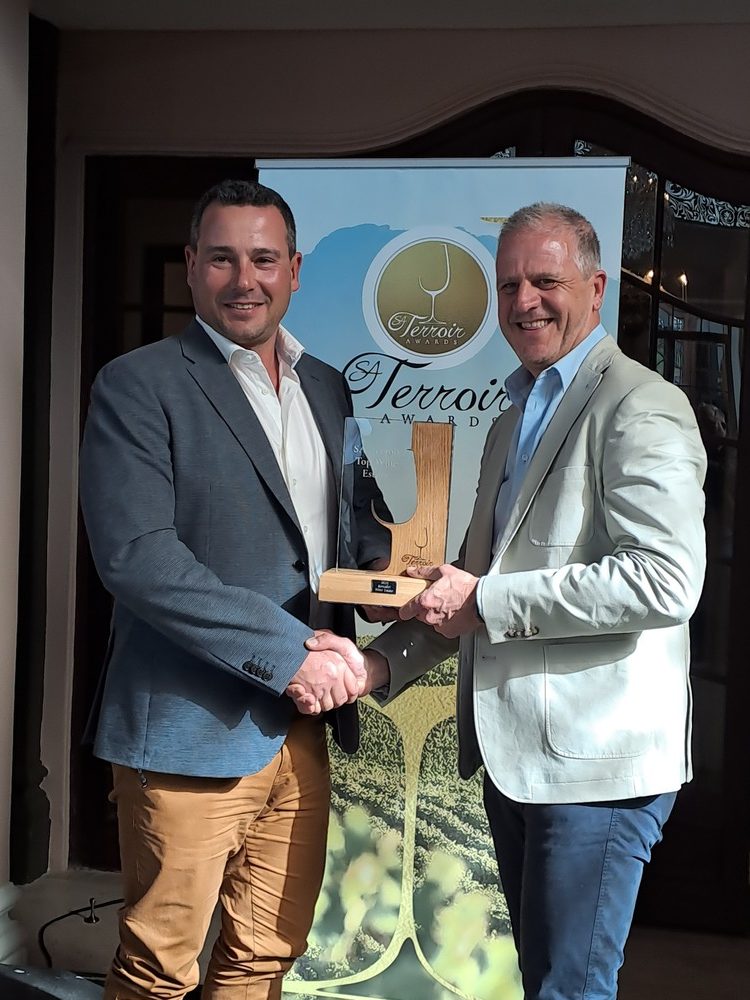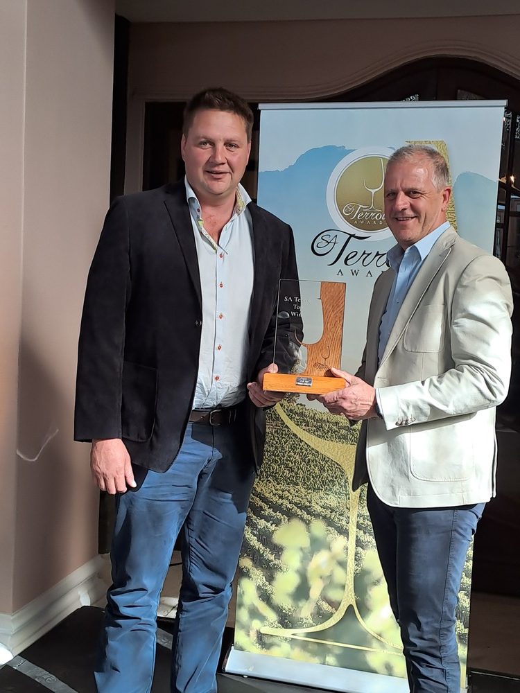 - Almenkerk Wingerde se Joris van Almenkerk het die trofee vir beste enkelwingerd-wyn ontvang. By hom is SANWSA-voorsitter, Christo Pienaar.