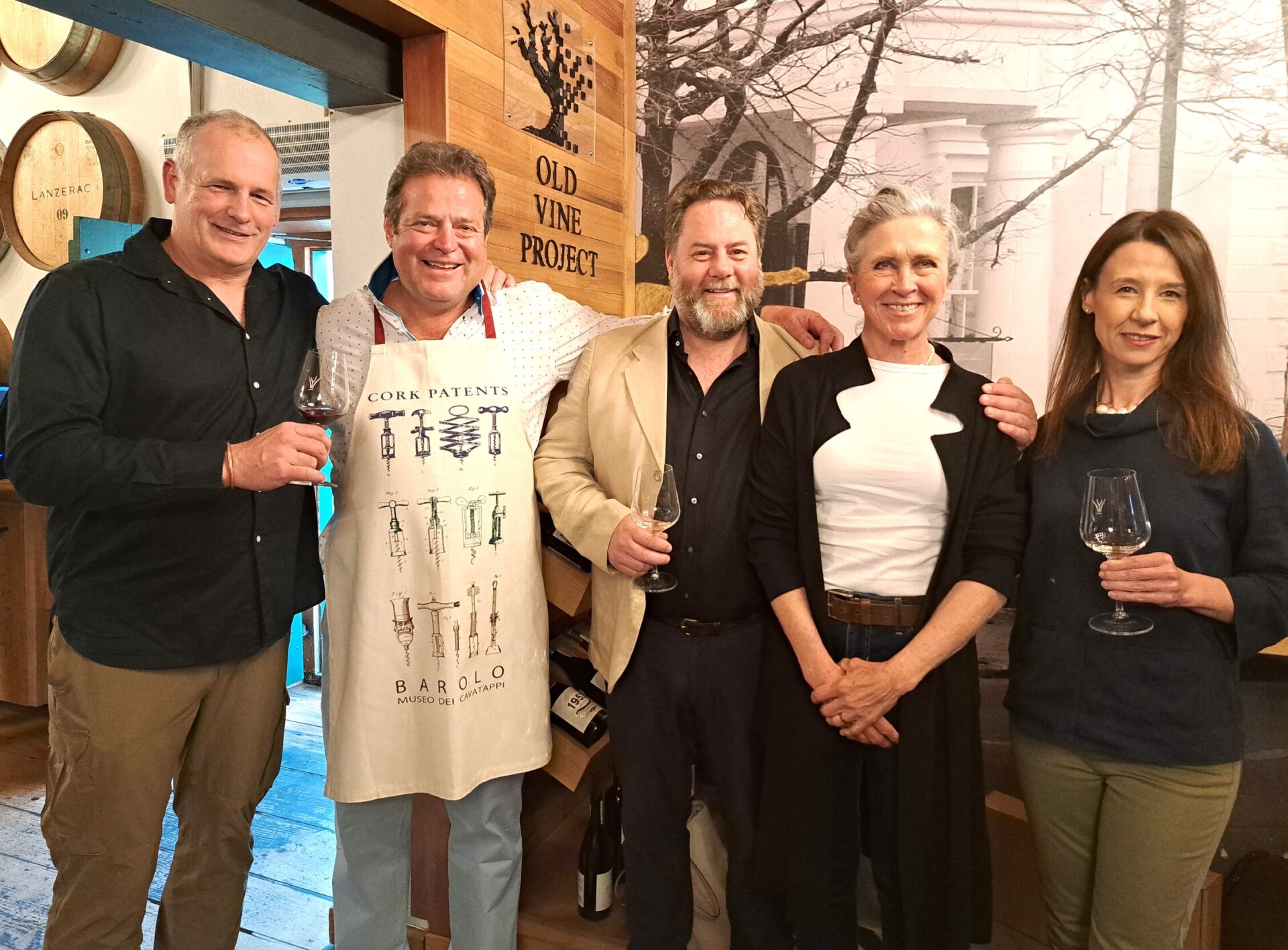 - Victor Sperling van Delheim Wynlandgoed, Daniel Kriel, eienaar van Stellenbosch se De Warenwarkt en Simon Wine Emporium, André Morgenthal, die OVP-projekbestuurder, Rosa Kruger, stigter van die OVP en Nolene Nel van die Chenin Blanc Assosiasie.