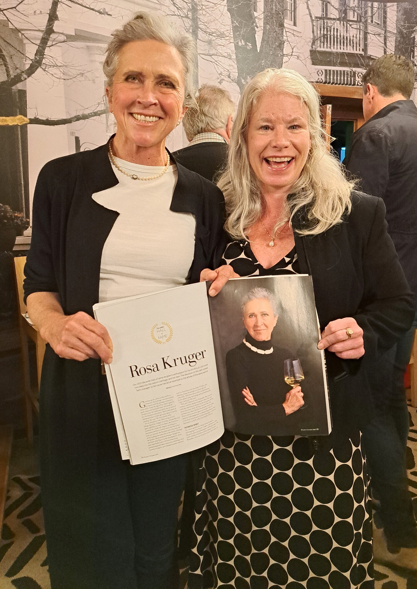 - Rosa Kruger, ’n wingerdboukundige, wat al sedert 2002 ou wingerde uitsonder en opteken en die stigter van die OVP. By haar staan Tina Gellie van Decanter.