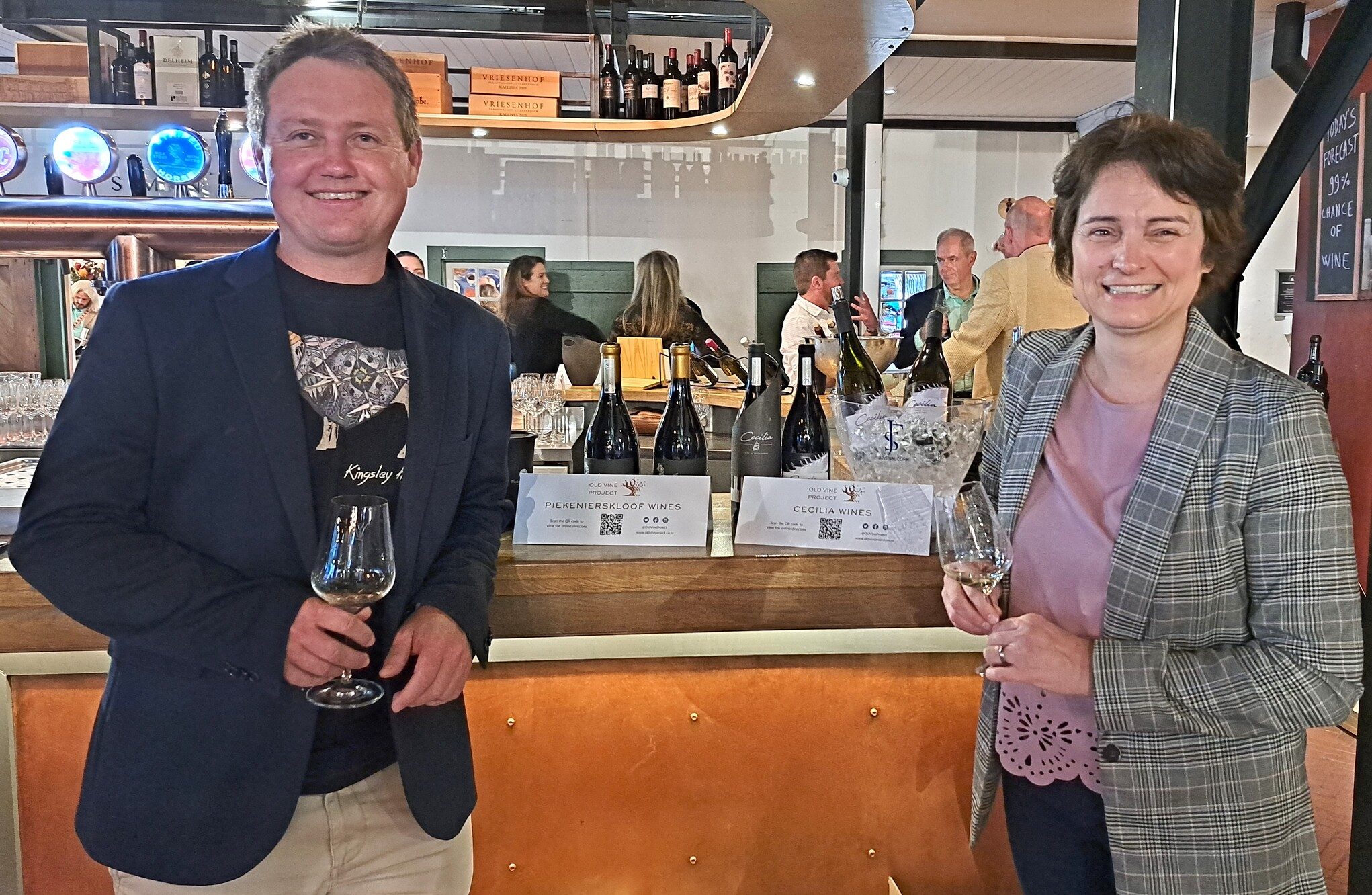 André Morgenthal is die OVP-projekbestuurder en Nadia Hefer die projek-konsultant. Nadia, ook die hoof van die ontwikkelingspan vir die Akademie, het gaste meer oor die Akademie vertel, voor gaste ’n wye verskeidenheid wyne van ouer wingerde kon proe en egte Suid-Afrikaanse peuselgoed uit die De Warenwarkt-kombuis kon geniet.