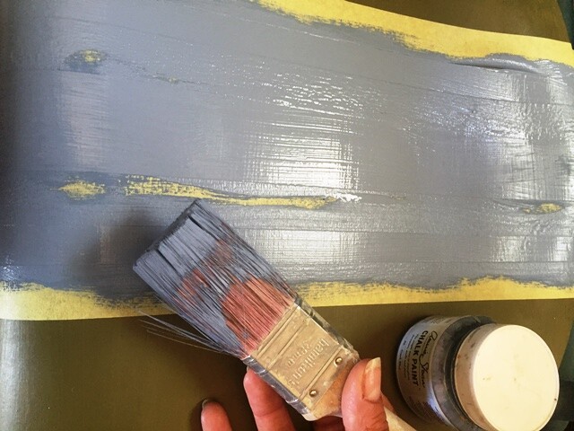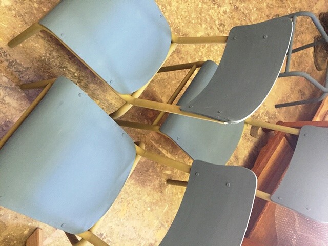 Verf die stoele in die kleur of kleure van jou keuse. Ons het op ‘n retro-tema besluit en Annie Sloan se Chalk Paint gebruik. Vir ons projek het ons besluit om die stel van ses stoele in twee kleurvariasies te verf. Vir die een variasie het ons die stoel se sitplek met Aubusson Blue geverf en die pote en raamwerk met Olive. Die stensel en strepe op dié variasie is in die kleur Versailles. Vir die ander variasie het ons die stoel se sitplek in Aubusson Blue geverf, die raamwerk in Olive en die stensil en strepe in Aubusson Blue, met aksente in Versailles.