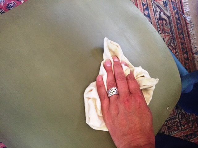 Nadat die stoele geverf is en die verf drooggeword het, wend ‘n laag Annie Sloan Clear Wax met ‘n sagte, gladde lappie aan en poleer tot dit ‘n gladde afwerking het.