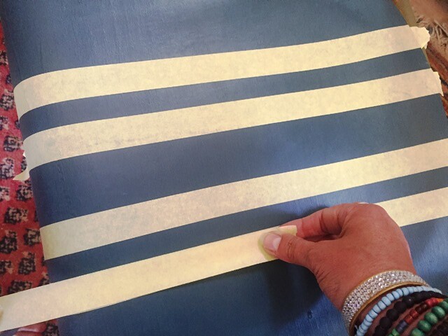 Gebruik maskeerband om strepe op die stoel se sitplek af te merk en verf in die kleur(e) van jou keuse. Verf twee lae en laat goed droog word. Verwyder die maskeerband.