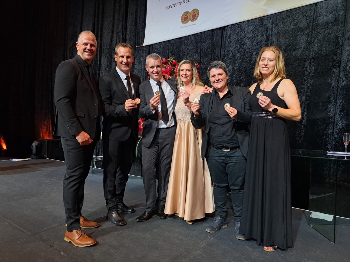 - Die wenner van die Duimpie Bayly Veritas Vertex-toekenning en beste produsent met minder as 10 inskrywings, is Benguela Cove Joie de Vivre Cap Classique 2019. Op die foto is voor: Michelle Waldeck, Christo Pienaar, Tilly Rea en agter is Tony Mcpherson en Charné van Zyl.