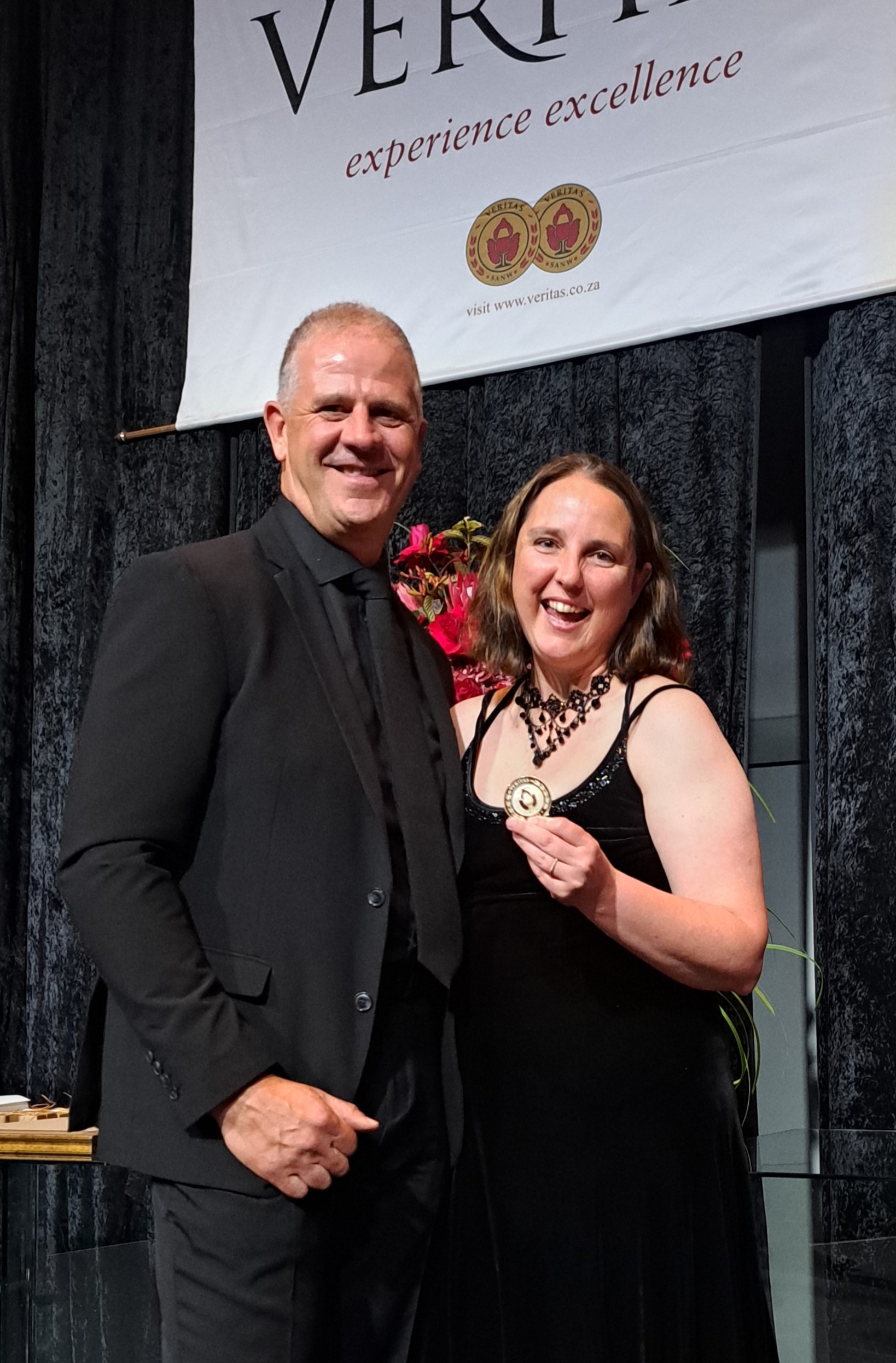 - Een Dubbelgoud en twee Goud is aan Boplaas Familiewingerde van Calitzdorp toegeken vir Portstylwyne. Hier is Christo Pienaar (Voorsitter Veritas) en Margaux Nel, wynmaker Boplaas.