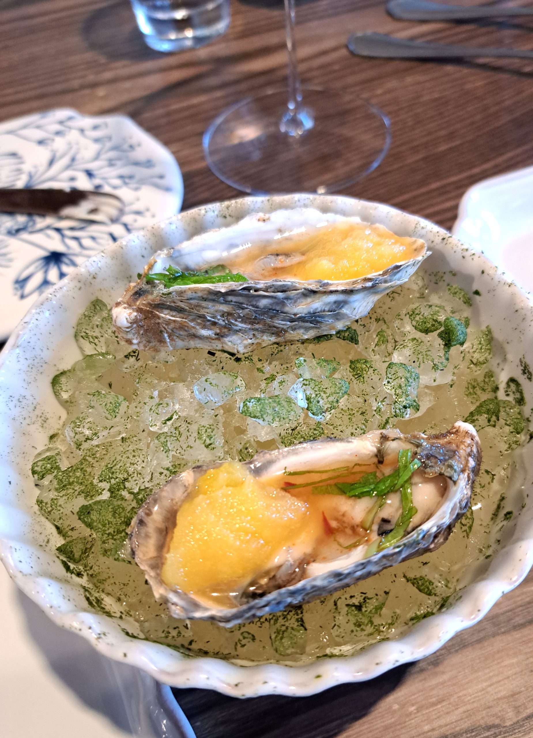 - Die Marble oester met ‘n Thai water sous, sitrus granita en ment.