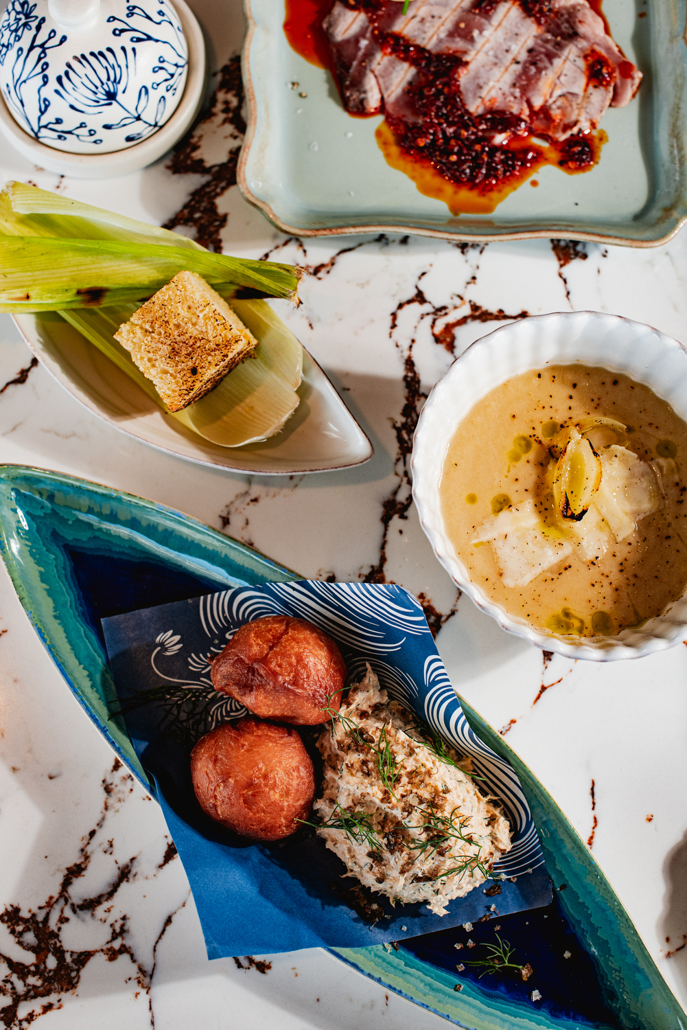 - Van die lekker voorgeregte is sagte magwenya snoekpatee met kappertjiesaad; oornaggeroosterde sop en tuna wat vinnig op die kole was en met soet brandrissie en avokado bedien word. (Foto: Claire Gunn)