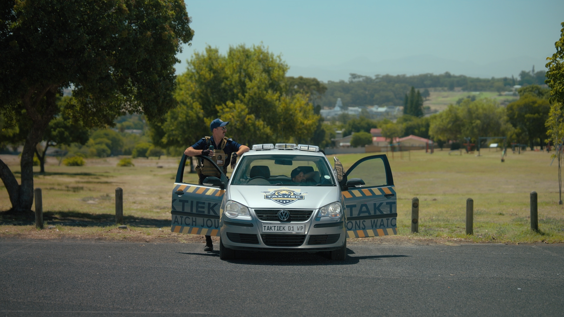 “In Suid-Afrika is daar egter reëls en regulasies oor hoe die polisie weergegee mag word en die naaste wat ons toe kon kom, is ’n sekuriteitsmaatskappy, maar hierdie een is in die veiligste dorp in die land. Dit het ons baie ruimte gegee om te speel.”
