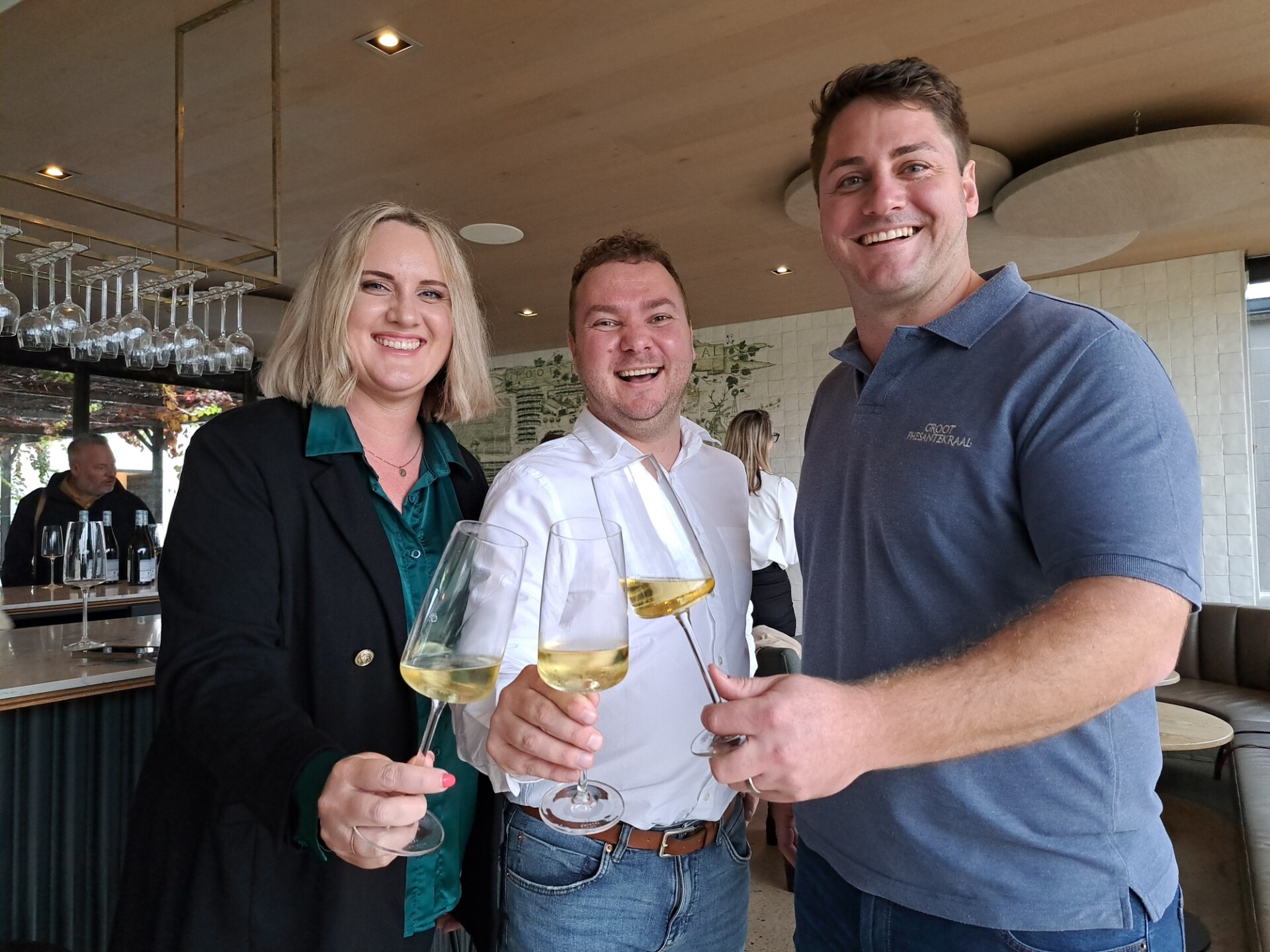 - Natasha de Villiers (Durbanville Wynvallei voorsitter), Johann Theron (Groot Phesantekraal handelsmerk-ambassadeur) en Richard Schroeder, wynmaker.
