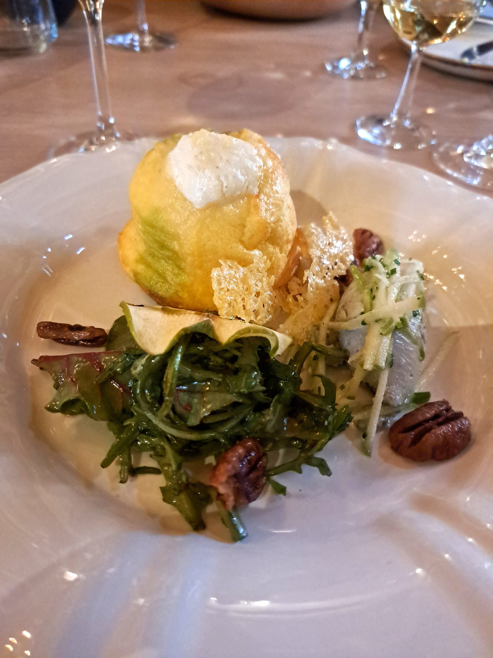 - Die dubbel-gebakte kaassouffle met appel, organiese pekanneute en bitterblare is met die Groot Phesantekraal Anna de Koning Chenin Blanc bedien.