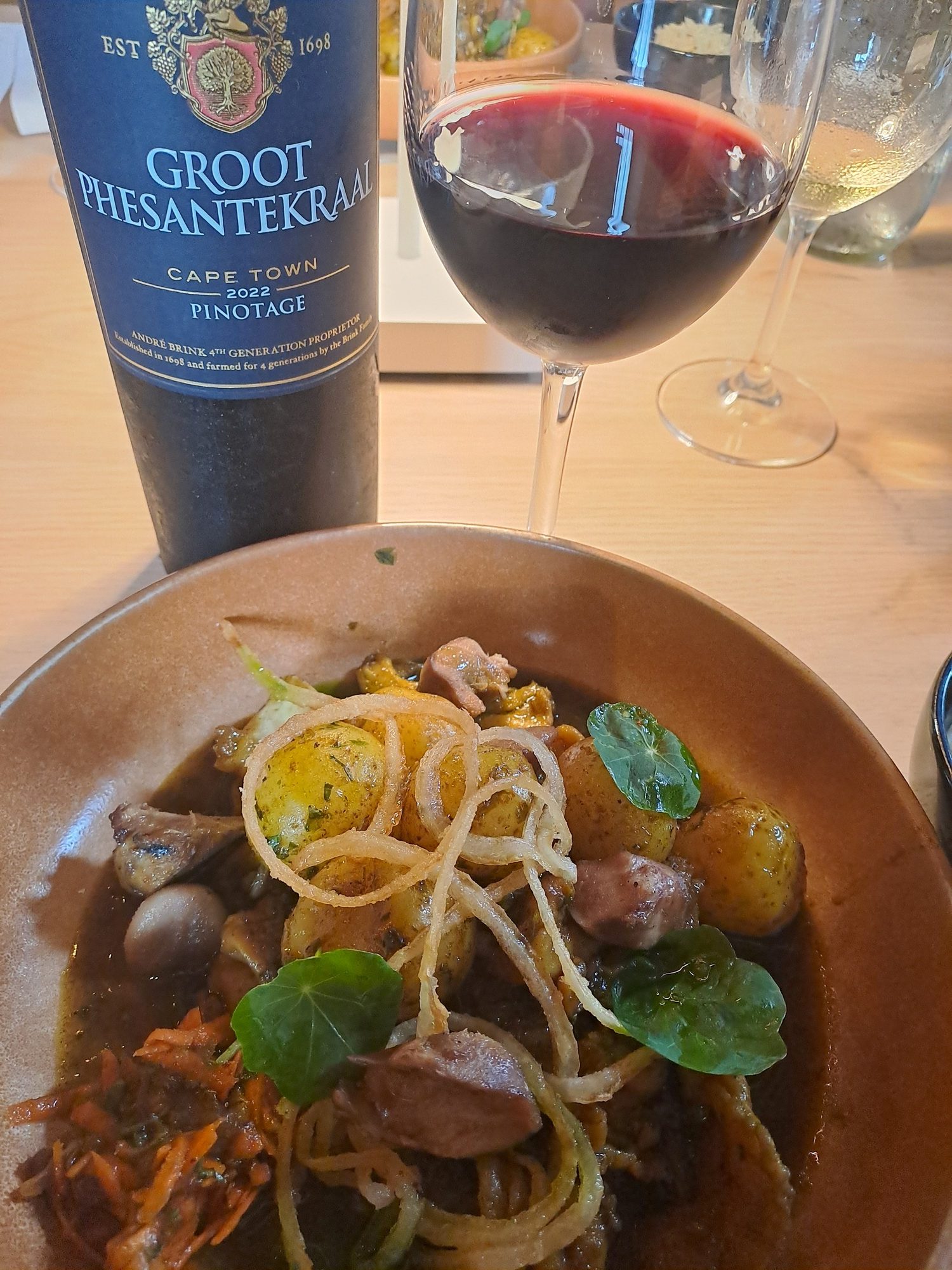 - Die lam-afval met confit aartappel, krakerige uie en komyn Basmatirys is met die Groot Phesantekraal Pinotage bedien.