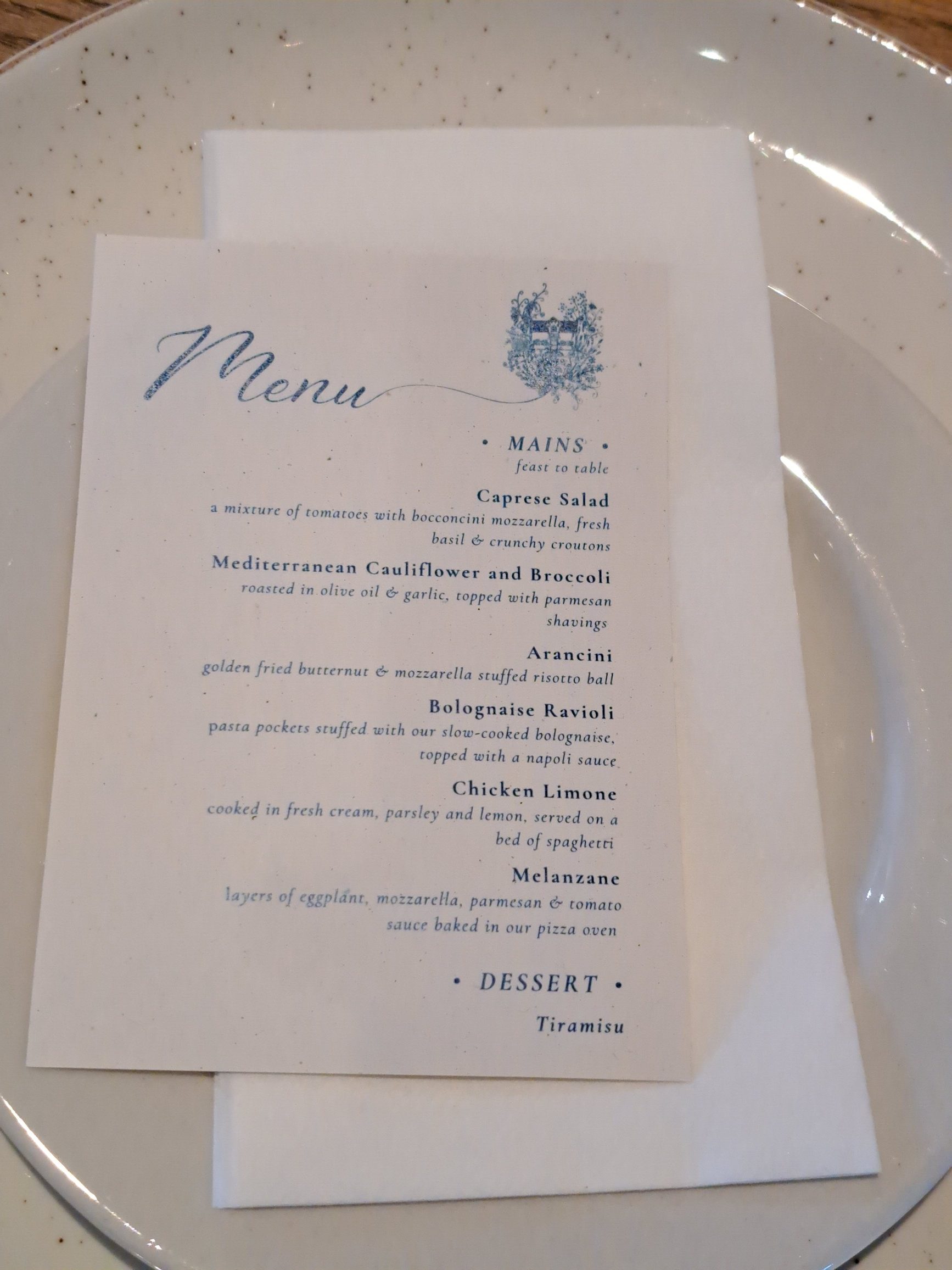 - Die spyskaart vir die dag is ‘n eg Italiaanse spyskaart, waar deelborde en verskeie pasta- en rysgeregte geniet is.