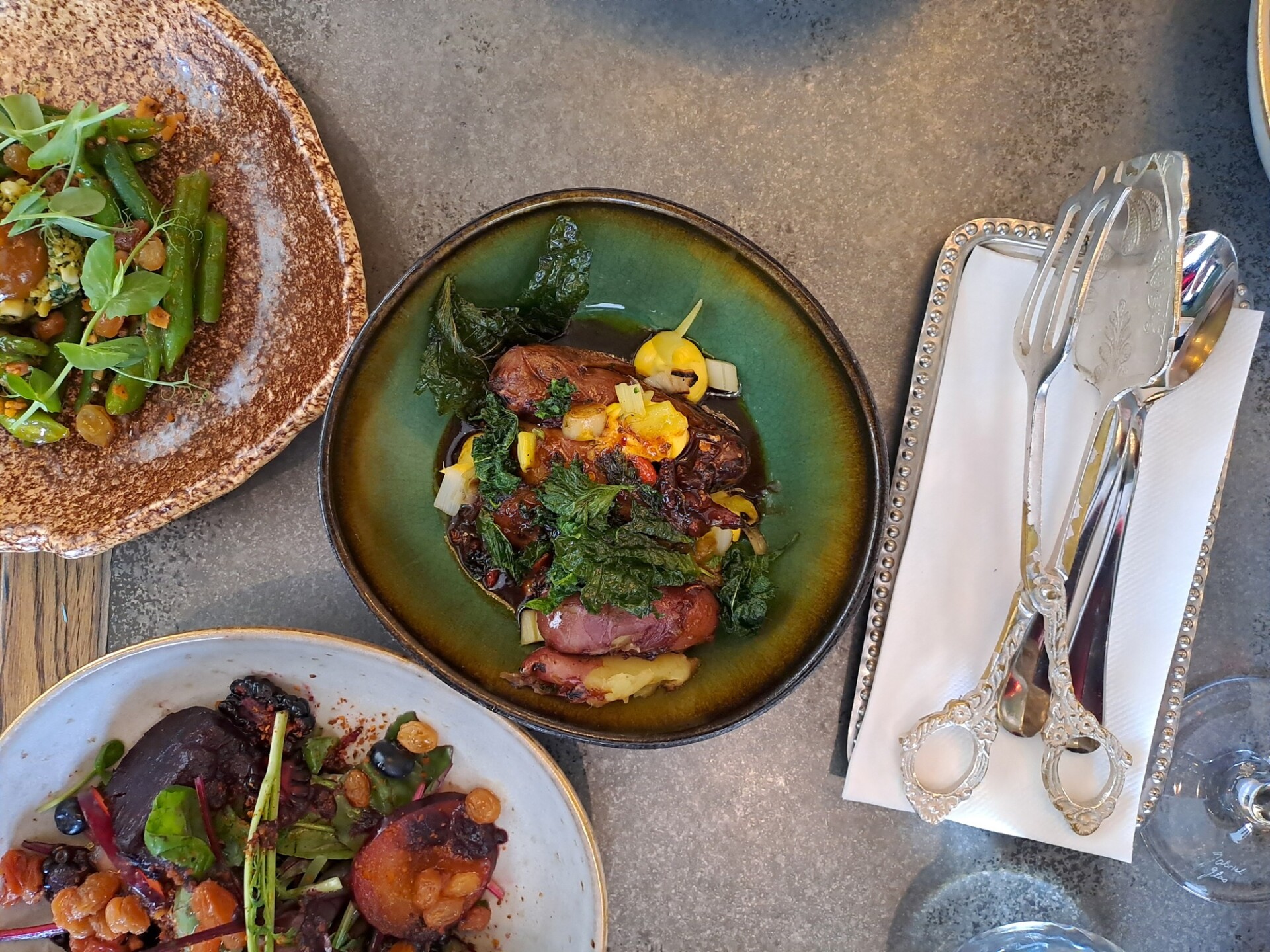 Op die tafel verskyn daar verder disse soos beestong met lamsvet en suurdeeg pangritata (gegeurde en gebraaide broodkrummels) met spekboom. Die paneer met kekerertjie-beslag wat bedien is met ‘n skeut suurdadel (tamarind)-blatjang en ‘n koljander-en-appel koolslaai het veral aandag getrek.